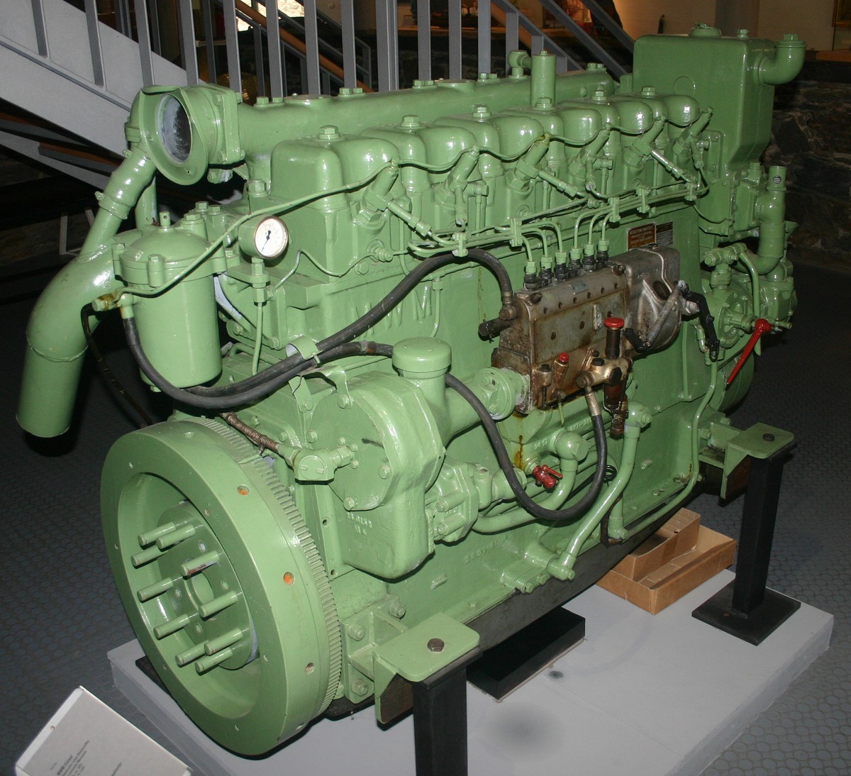 Deze motor is uitgevoerd als scheepsmotor.