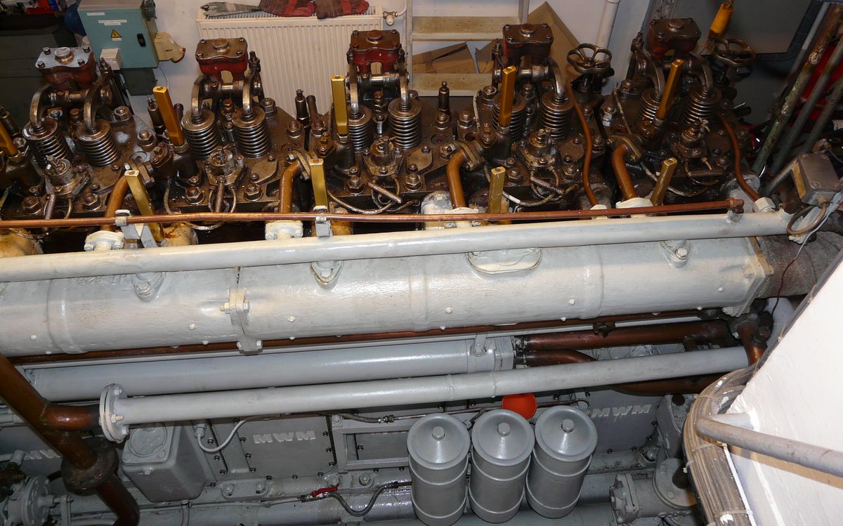 Een 8 cilinder MWM RHS 418 A levert 180 pk bij 1500 tpm. Maximum vermogen 220 pk (bij 1800 tpm?). De motor wordt met lucht gestard.
