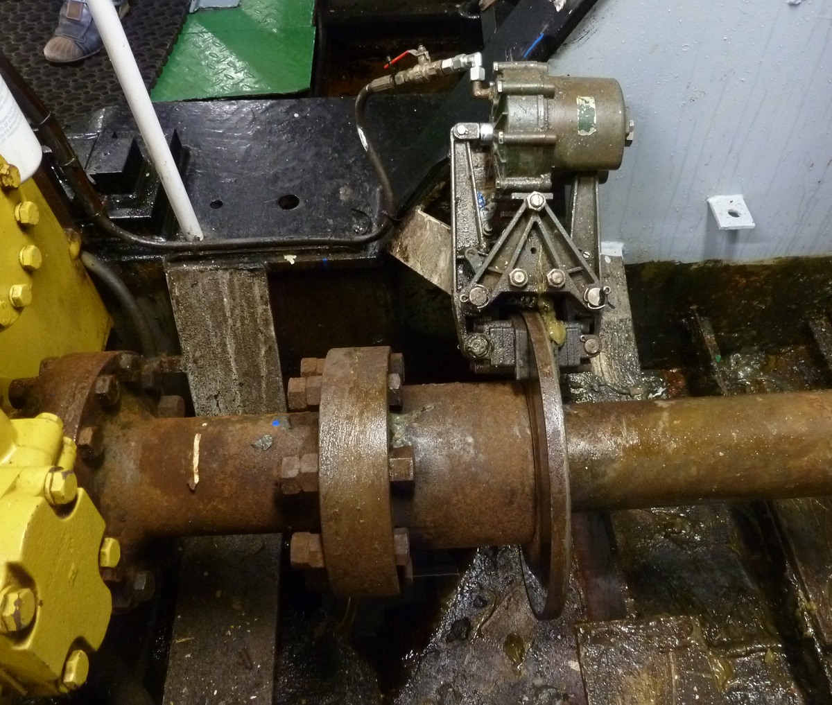 Perslucht bekrachtigde schroefas vang op de schroefas van een beunschip.
