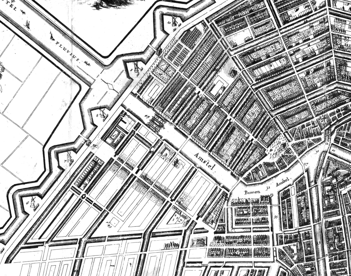 010001001033 Sterk gedetailleerd!). Stroomopwaarts gezein, krijgt men na de Amstelschutsluizen, de Amstel Sluys (een vaste stenen brug met 12 bogen, thans de Hoge Sluis geheten), het Blokhuis (ter bewaking van de toevaart) en de Amstelbomen (ter afsluiting van het vaarwater). De keersluizen bij de Weesperstraat zijn verdwenen (of niet getekend), maar de vaste bruggen zijn blijven bestaan.