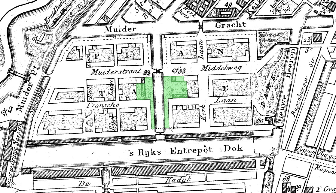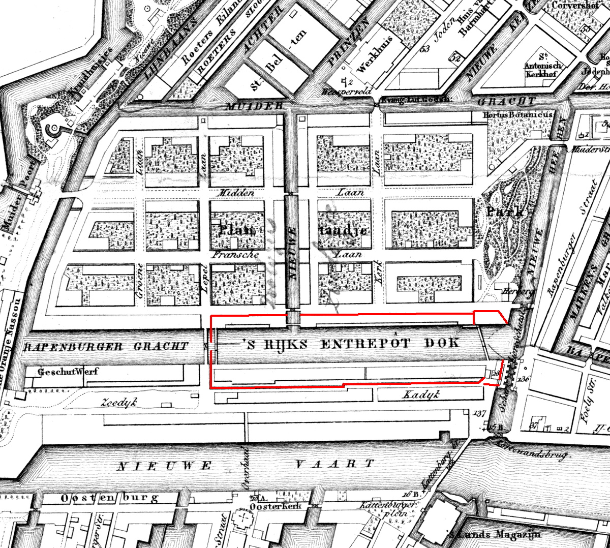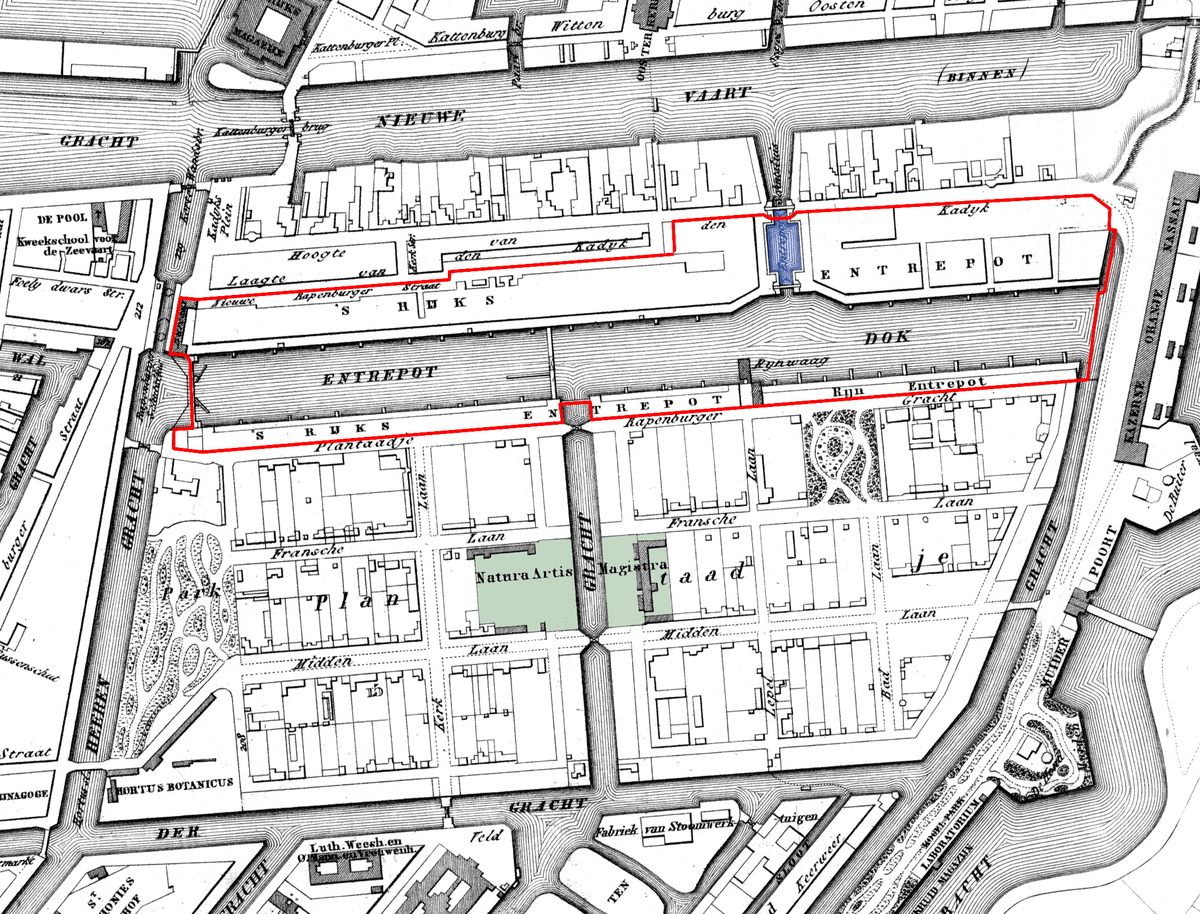 In rood de grenzen van het Entrepôt. Het was via de Scharrebiersluis vanuit het IJ bereikbaar en via de Nieuwe Prinsengracht vanaf de Amstel.