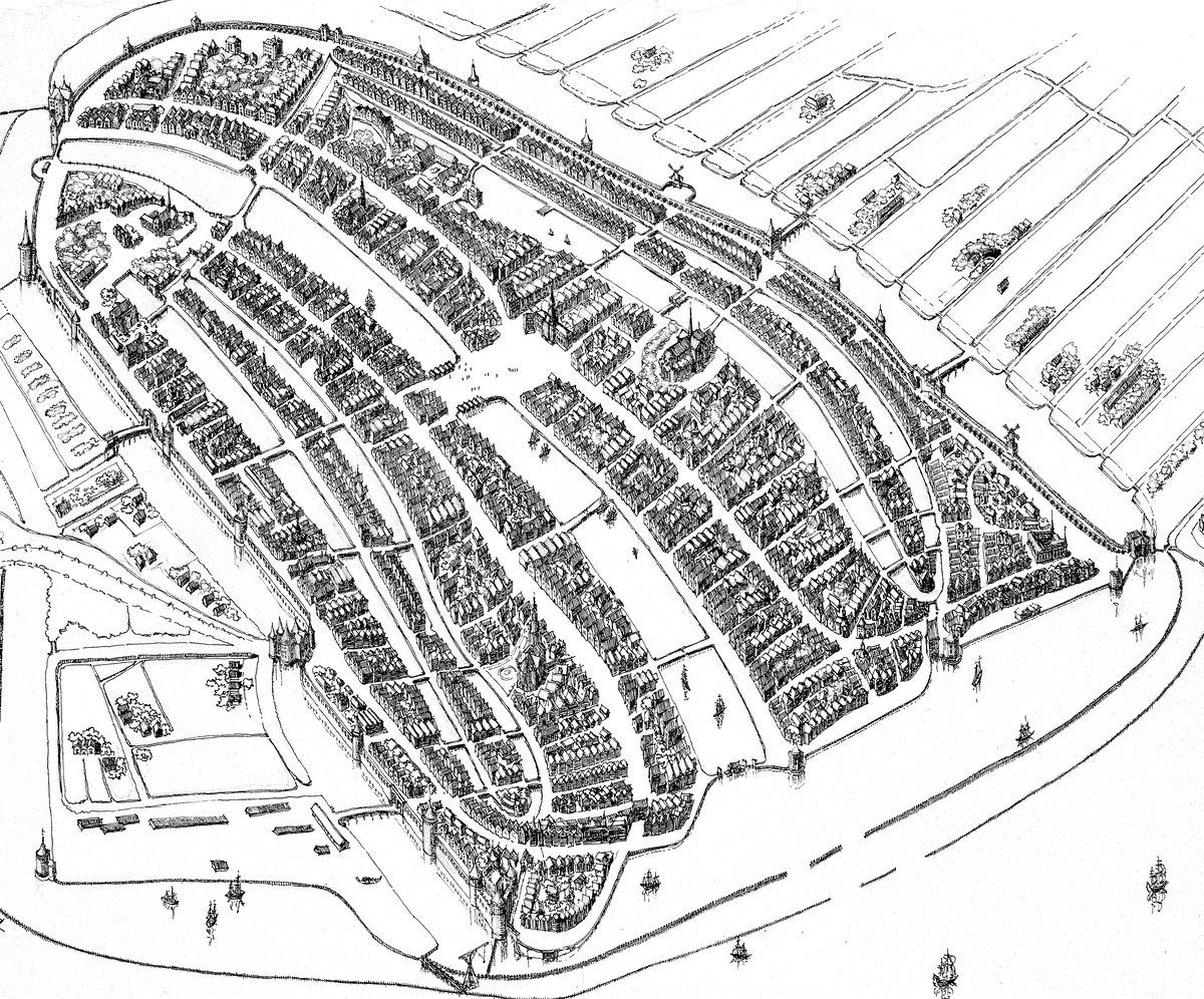 stadsboom, met staande mast bereikbaar. Als de verdedigingslinie zich naar buiten verplaatst (ca. 1595) blijft een vrij hoge, maar toch vaste brug (de Blauwbrug) een hindernis. De Blauwbrug is weliswaar hoog maar de afbeelding toont dat ieder zijn mast moet strijken. (