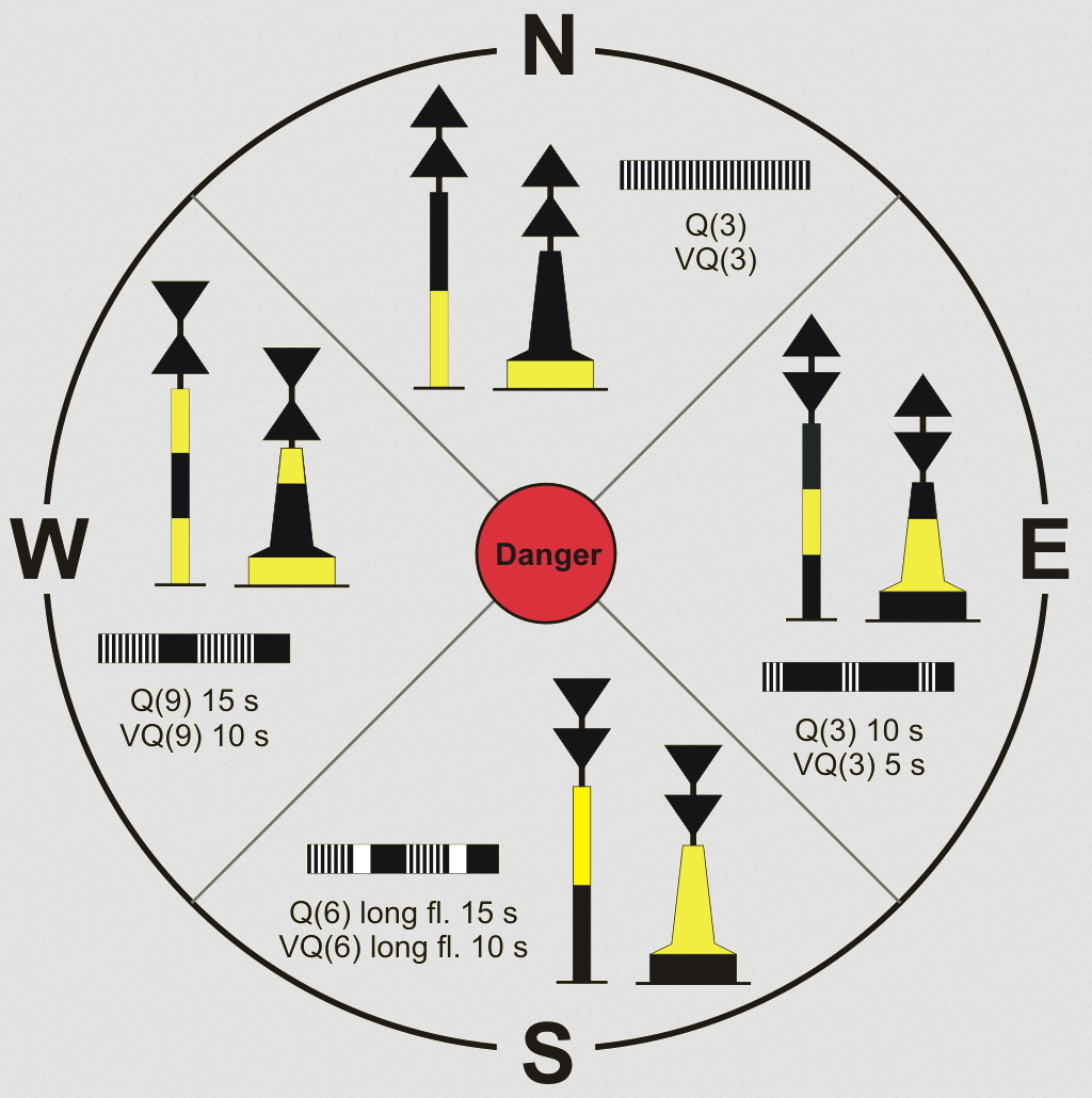 De zes verschillende bakens van het cardinale stelsel kennen elk slechts