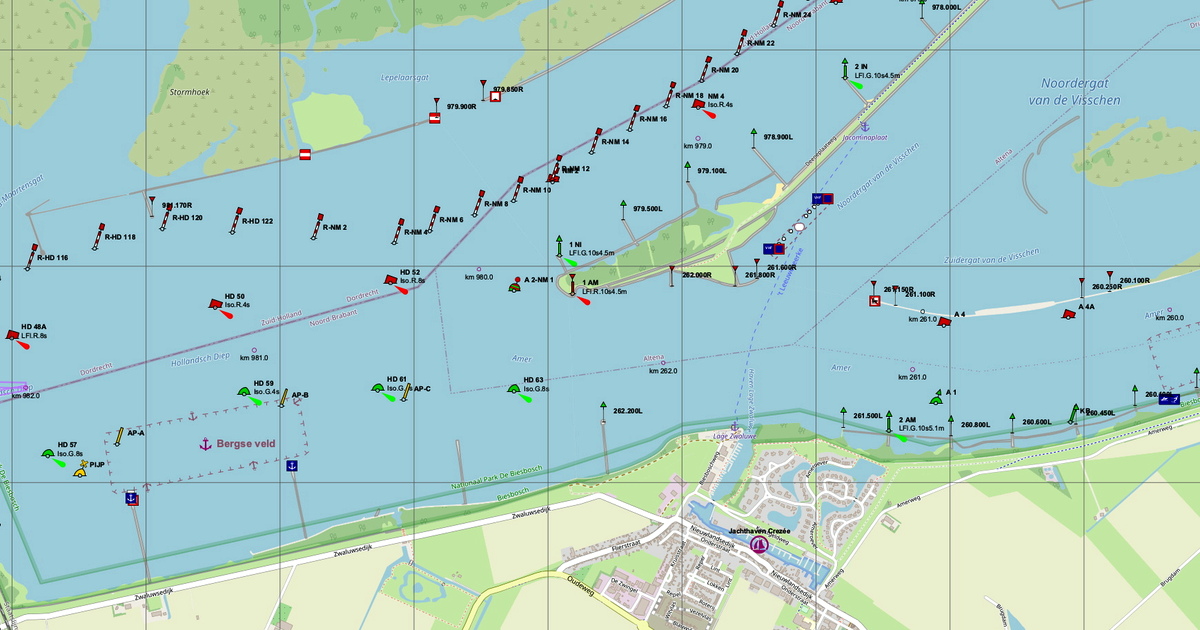 Waterkaart tonende laterale bebakening, aanvullende bakens, kribbakens enz.