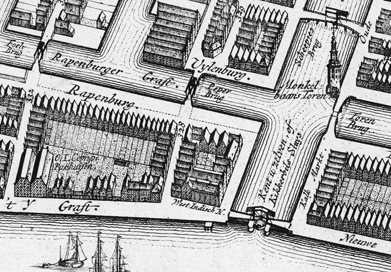 Fragment van een kaart tussen 1774 en 1782 vervaardigd door Gerred de Broen en uitgegeven door F.W. Greebe. Oriëntatie: zuidwest boven. De IJ-gracht, het West-Indisch huis, Rapenburg, de vloedkering en de Kalkmarkt zijn duidelijk te onderscheiden.