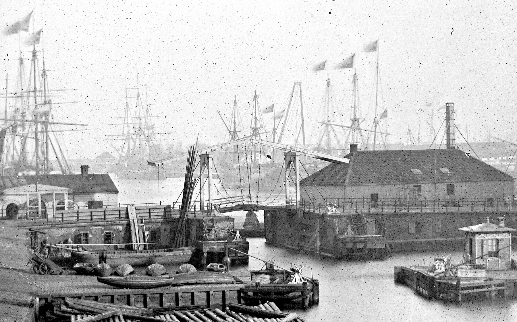 De schutsluis in 1863 met rechtsachter de Keulsewaag aan de IJ-gracht. Op de voorgrond links liggen roeiboten voor het verkeer met de schepen in het Oosterdok op de oever. Foto: Jacob Olie.