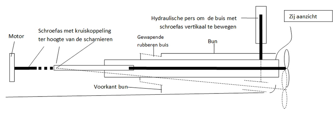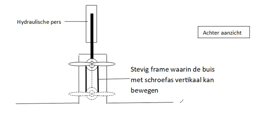 Het uiteinde van de schroefaskoker wordt middels een hydraulische cilinder, die vertikaal in het achterschip opgesteld is en waterdicht door de