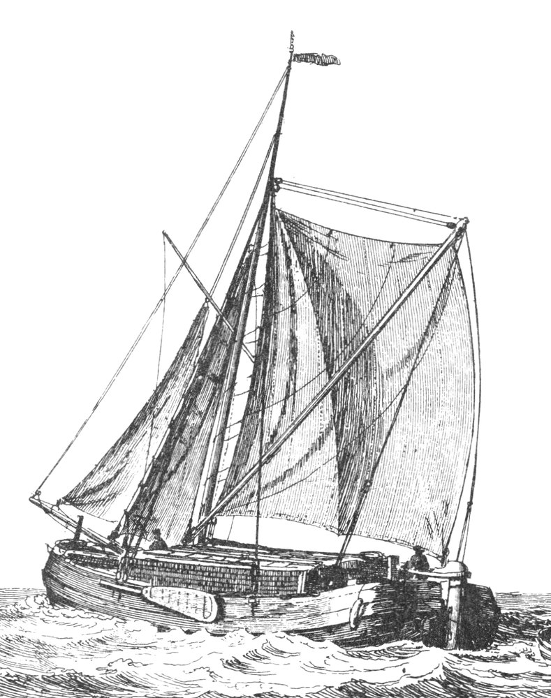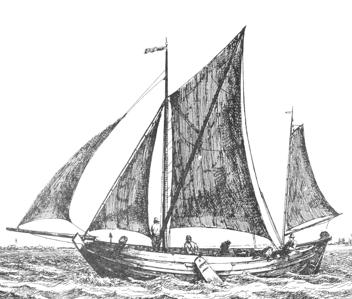Een schokker met een sprietzeil en druil getekent door Groenewegen.