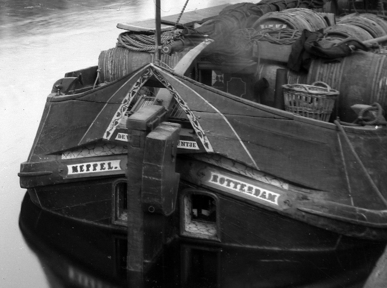 De houten hektjalk 'De Vrouw Trijntje' voer blijkbaar als beurtschip op het traject Meppel-Rotterdam.