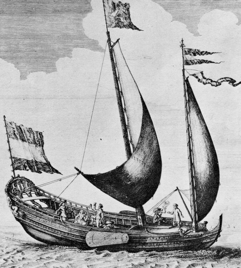 (7): Prent van een boeier (razeilboeier?) en ook van een veerschip(wijdschip?) door Dirk Eversen Lons uit ca. 1642, via Rijks Studio.