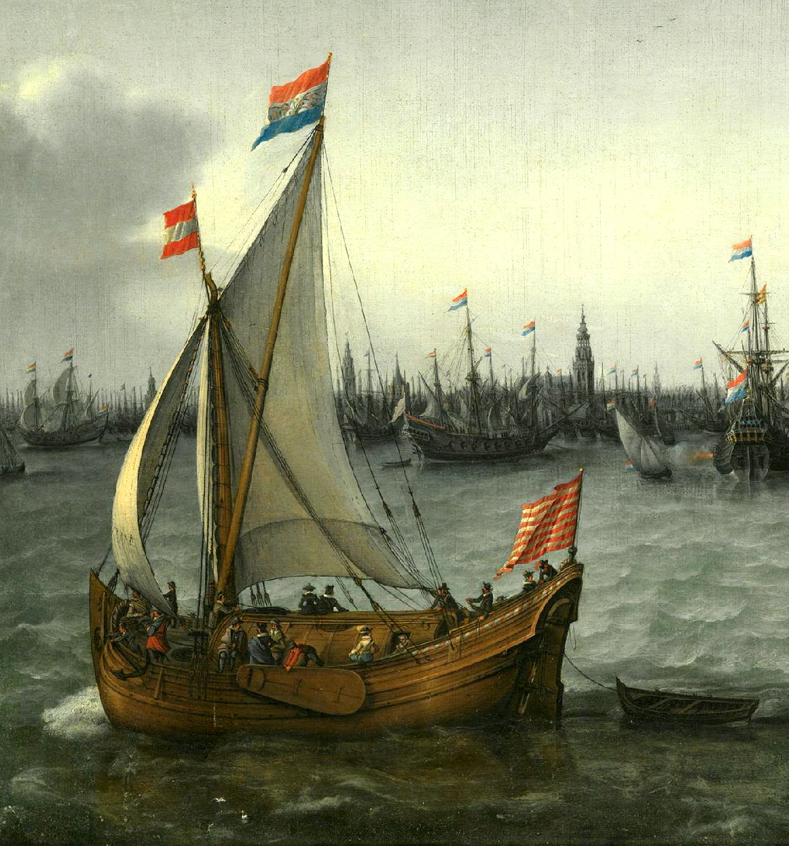 Een toch vrij sober gesierd Wijdschip of is het een Vlieboot? Fragment van een schilderij van Hendrick Cornelisz. Vroom uit 1630 voorstellende de Haven van Amsterdam. PD.