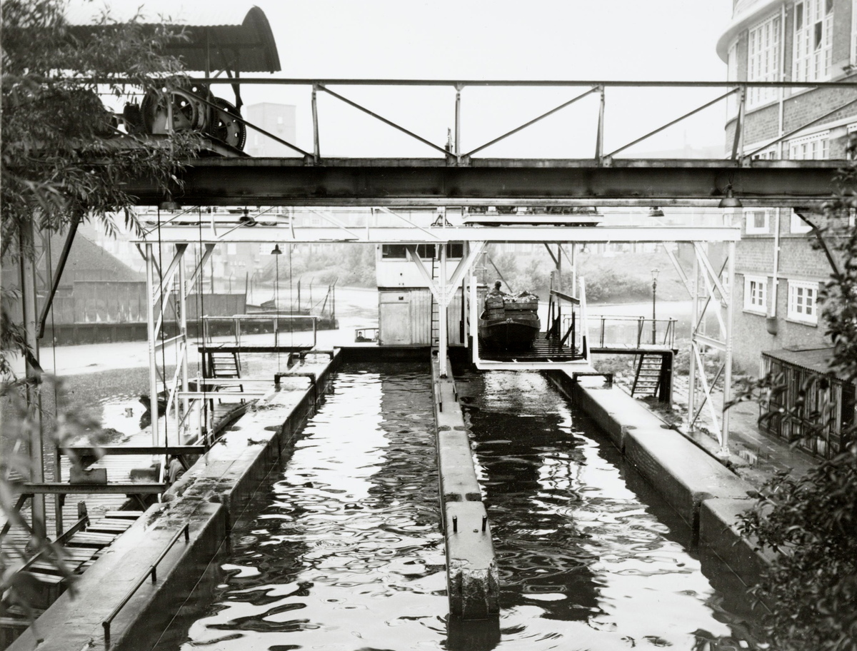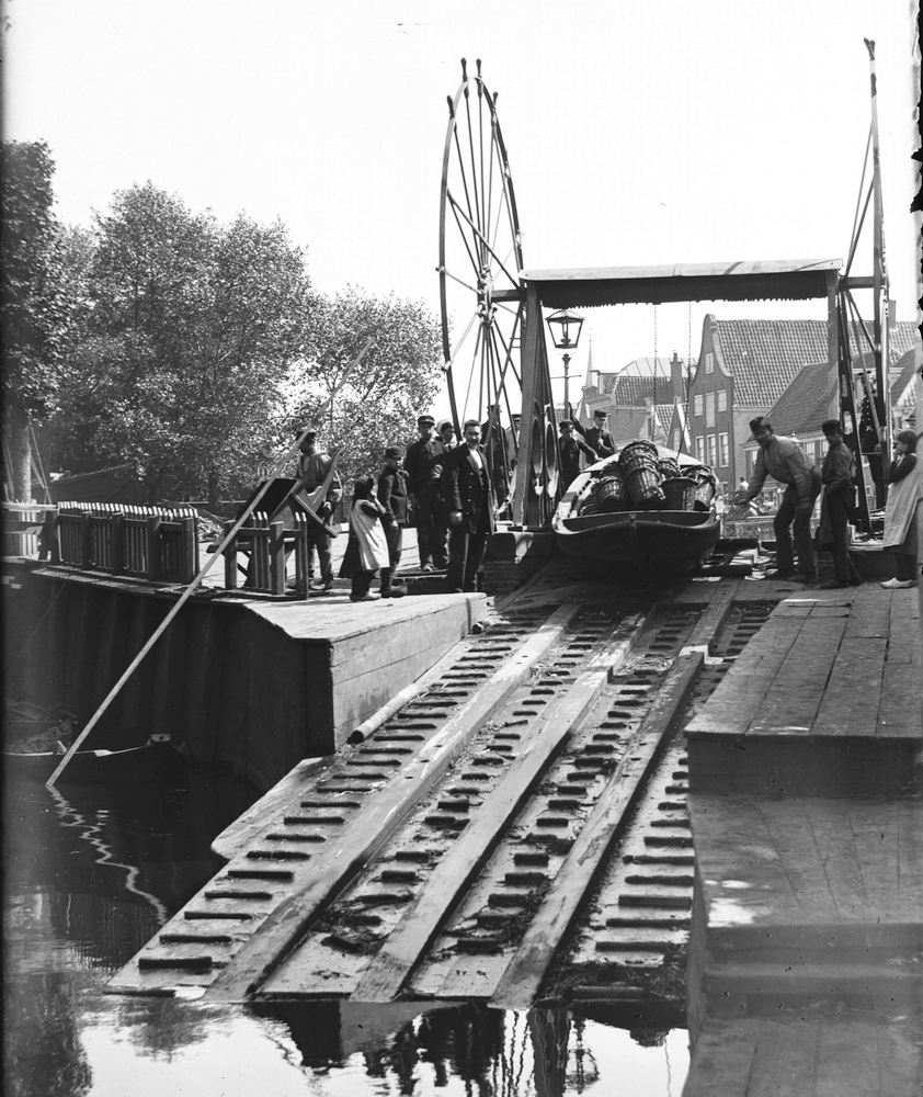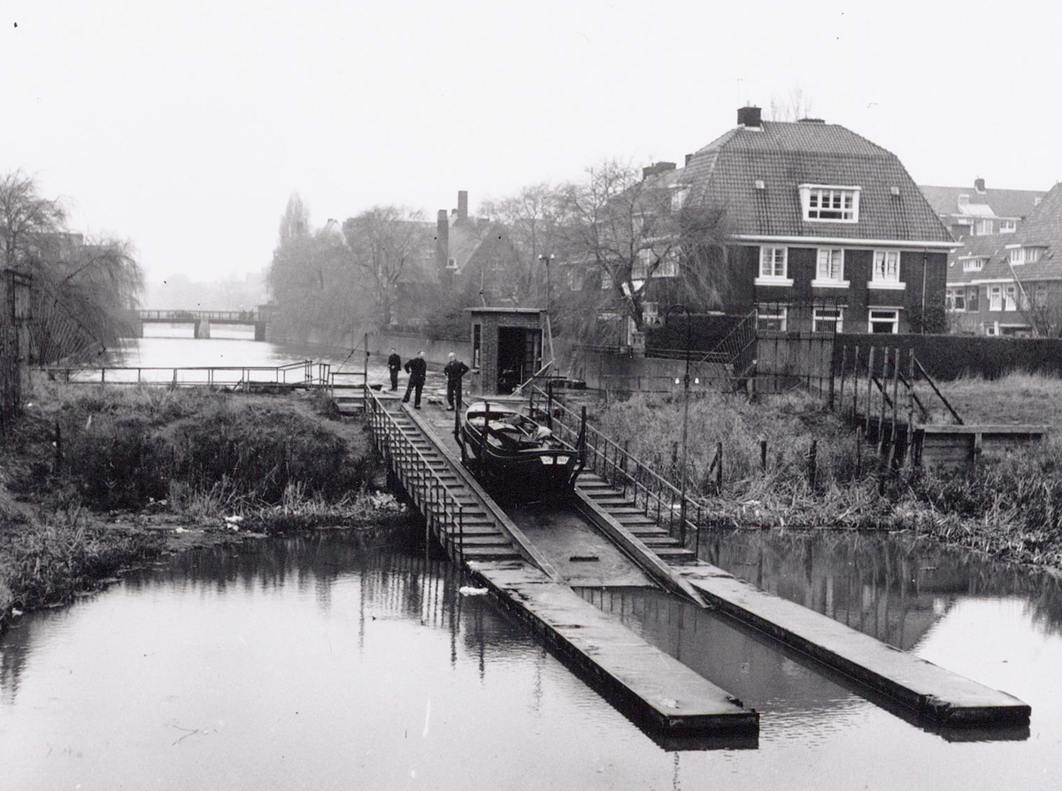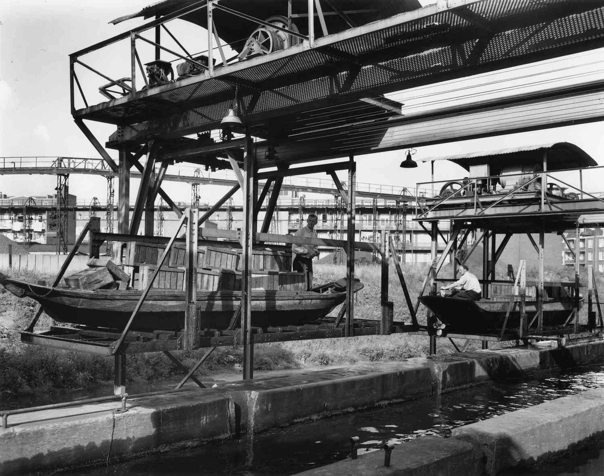 De uit 1916 stammende dubbele liftoverhaal tussen de Kostverlorenvaart en de Postjeswetering. In de topjaren passeerden er, op weg naar de Markten, circa 90 schuiten per dag. De schuiten liggen op polderniveau en de mannen staan voor de 'bak' met het water van de Kostverlorenvaart.