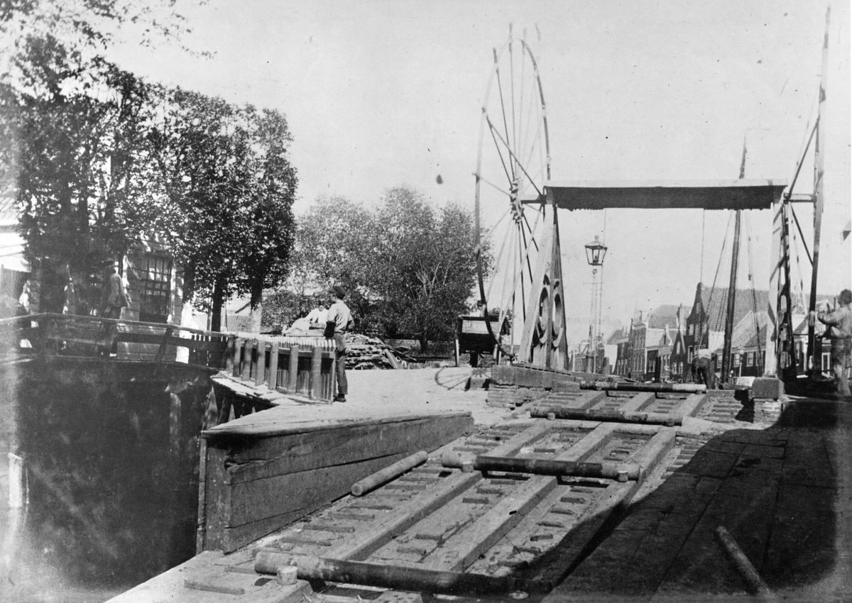 De Overhaal met rechts daarvan de Theekoepel van het Polderhuis en daar weer naast de sluis. Voor de sluis liggen twee grondbakken of zogenaamde 'arken' te wachten. Het is moeilijk te zeggen of ze verder de polder in gaan of dat ze juist de stad in moeten. Overal werd gebouwd en was zand nodig!