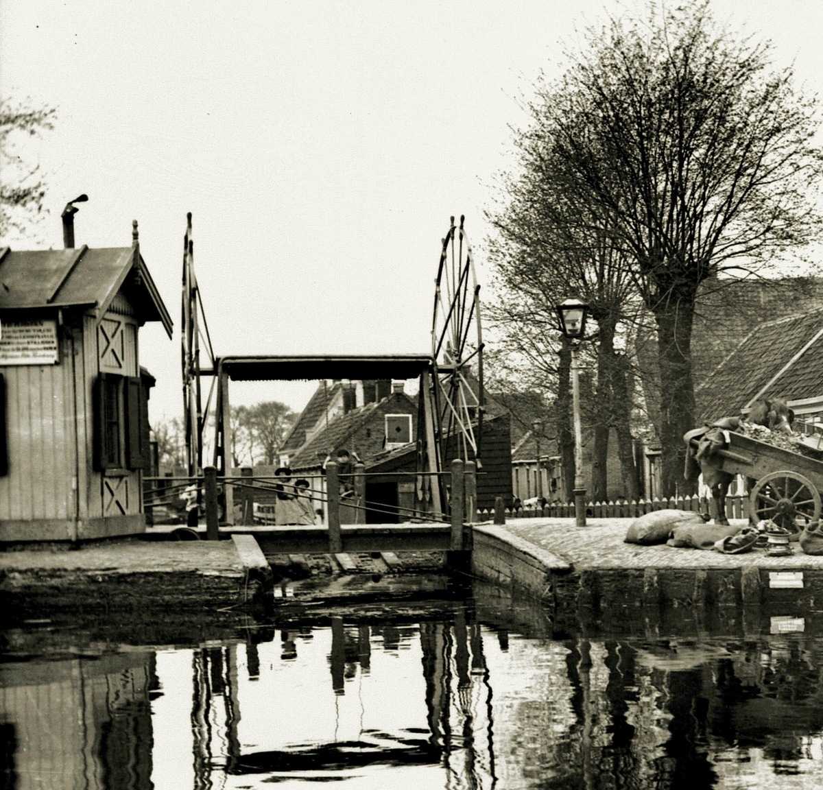De overhaal tussen de Boerenwetering en de Mennonietensloot in zijn nadagen. De Boerenwetering is het water van de Hobbema- en Ruysdaelkade. De wetering lag lager dan het stadspeil en was door middel van een sluis bij het Polderhuis met de stadswateren verbonden. Bij de sluis was het een komen en gaan van tuindersschuiten en om de