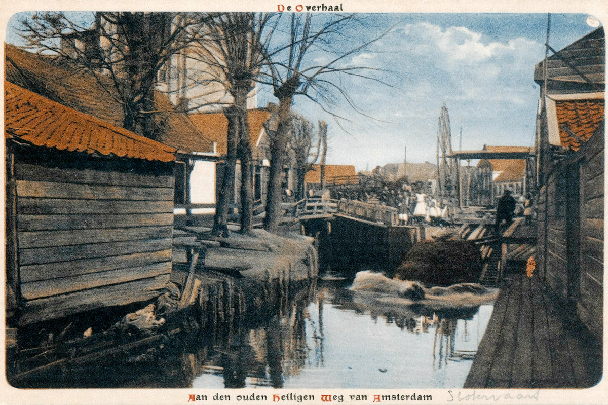 Het onderschrift 'Aan den Ouden Heiligenweg' slaat op de bebouwing op de achtergrond, die over de Kostverloren- en Overtoomsevaart staat. De benaming 'Heiligenweg', die op de prent voorkomt, dateert namelijk nog van voor de Alteratie (1578) , want daarna gingen de Heiligewegsvaart en de Heiligenweg in de volksmond respectievelijk Overtoomsevaart en Overtoomseweg heten.
