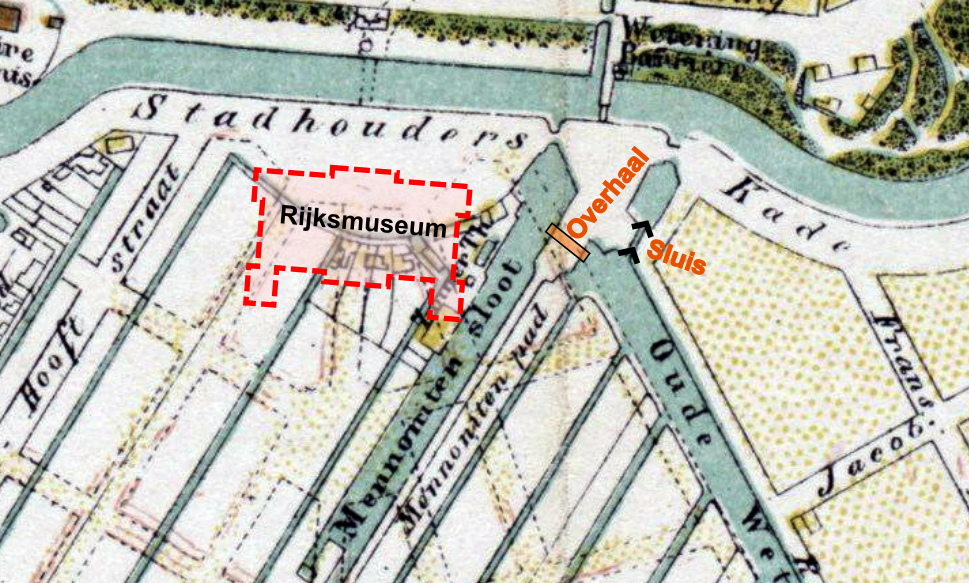 De situatie tijdens de inrichting van het Museumkwartier. De Mennonietensloot lag op stadspeil en door de Overhaal flink wat goedkoper te maken dan de sluis, kozen de tuinders massaal voor de overhaal. Het waterverlies veroorzaakt door het schutten met de sluis nam daardoor flink af en daar ging het Amsterdam om. De gemeente Amsterdam was namelijk eigenaar en dus belast met de bemaling van het aangrenzende deel van de Binnendijkse Buitenveldertse polder.