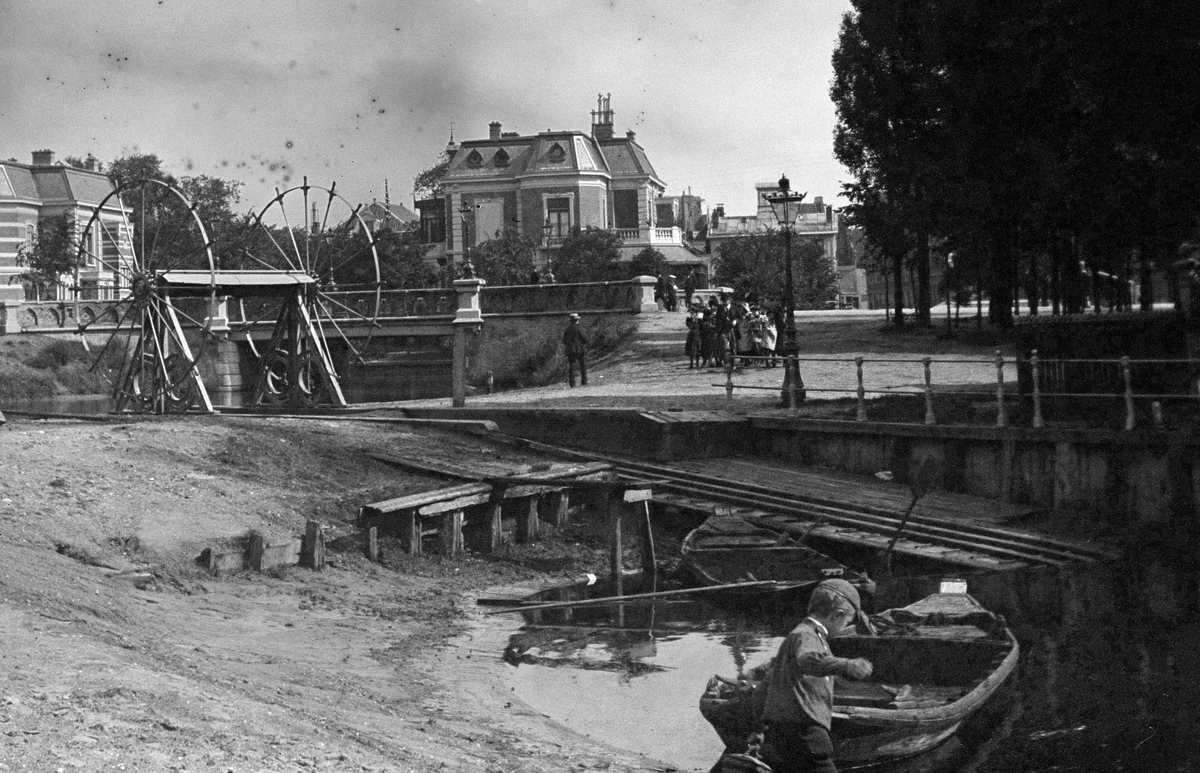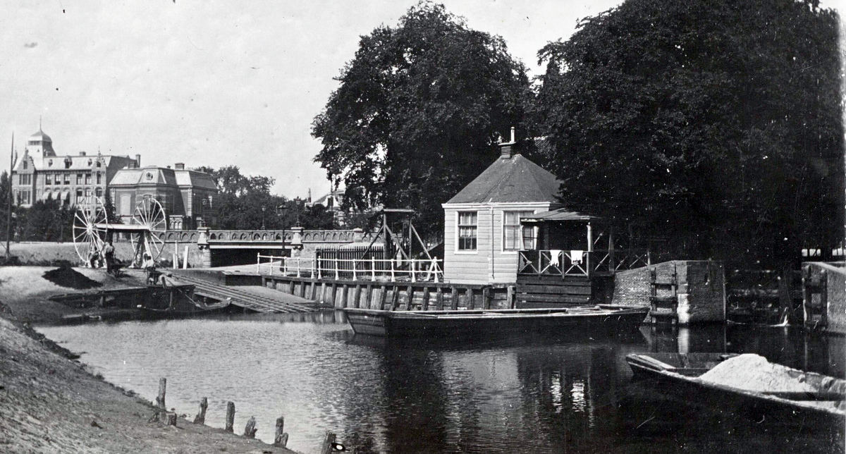 Op de achtergrond de Wiegbrug; de verbinding tussen De Clercqstraat en de Admiraal De Ruyterweg. Situatie rond 1910.