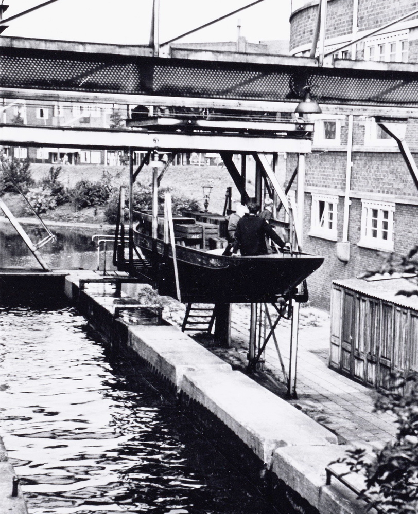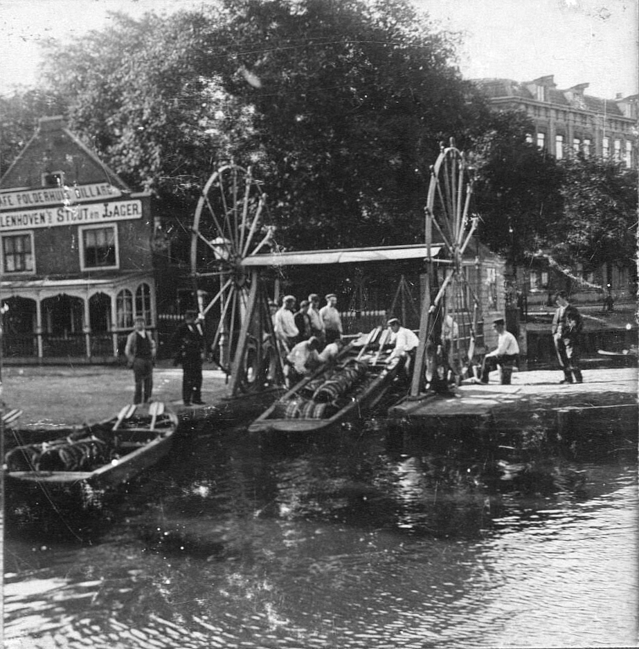 De tuindersschuiten zijn op hun weg terug. De linker schuit lijkt een lading mest (uit de manège van de bereden politie?) mee te nemen. Het lijkt een houten schuit met binnenboordmotor te zijn. De rechter schuit is van staal en is motorvaartuig. Jammer genoeg zijn er weinig foto's van deze overhaal te vinden en rechtenvrije foto's zijn helemaal schaars. In 1955 werd de liftoverhaal verder buiten de stad geplaatst. Vier jaren daarna verdween hij toch helemaal.
