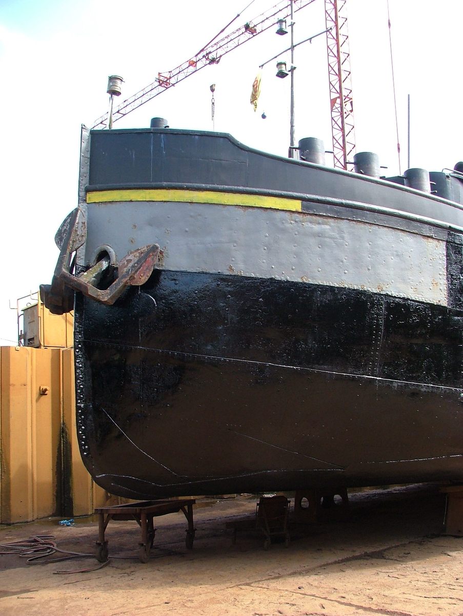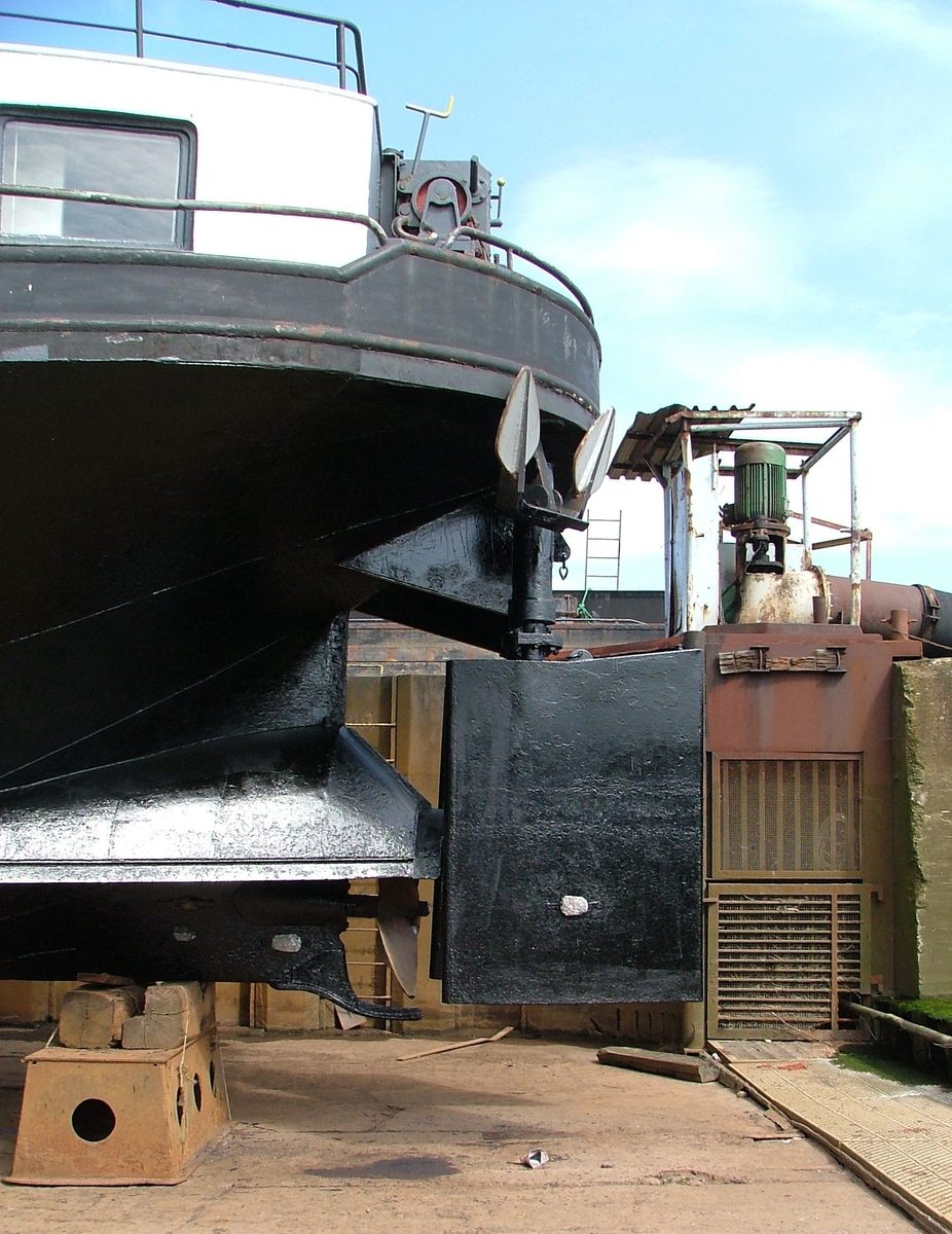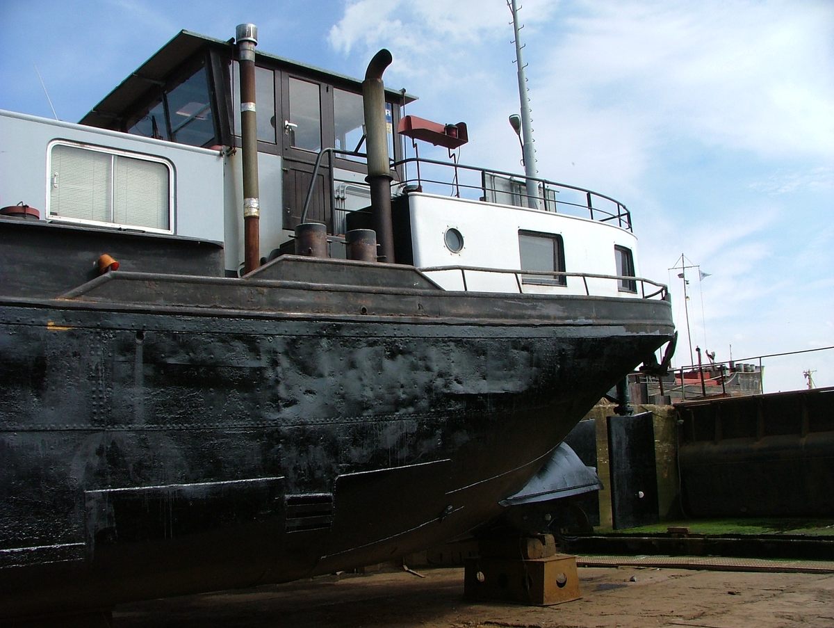 Rechtsachter ziet men de pomp waarmee het dok droog gepompt wordt en de