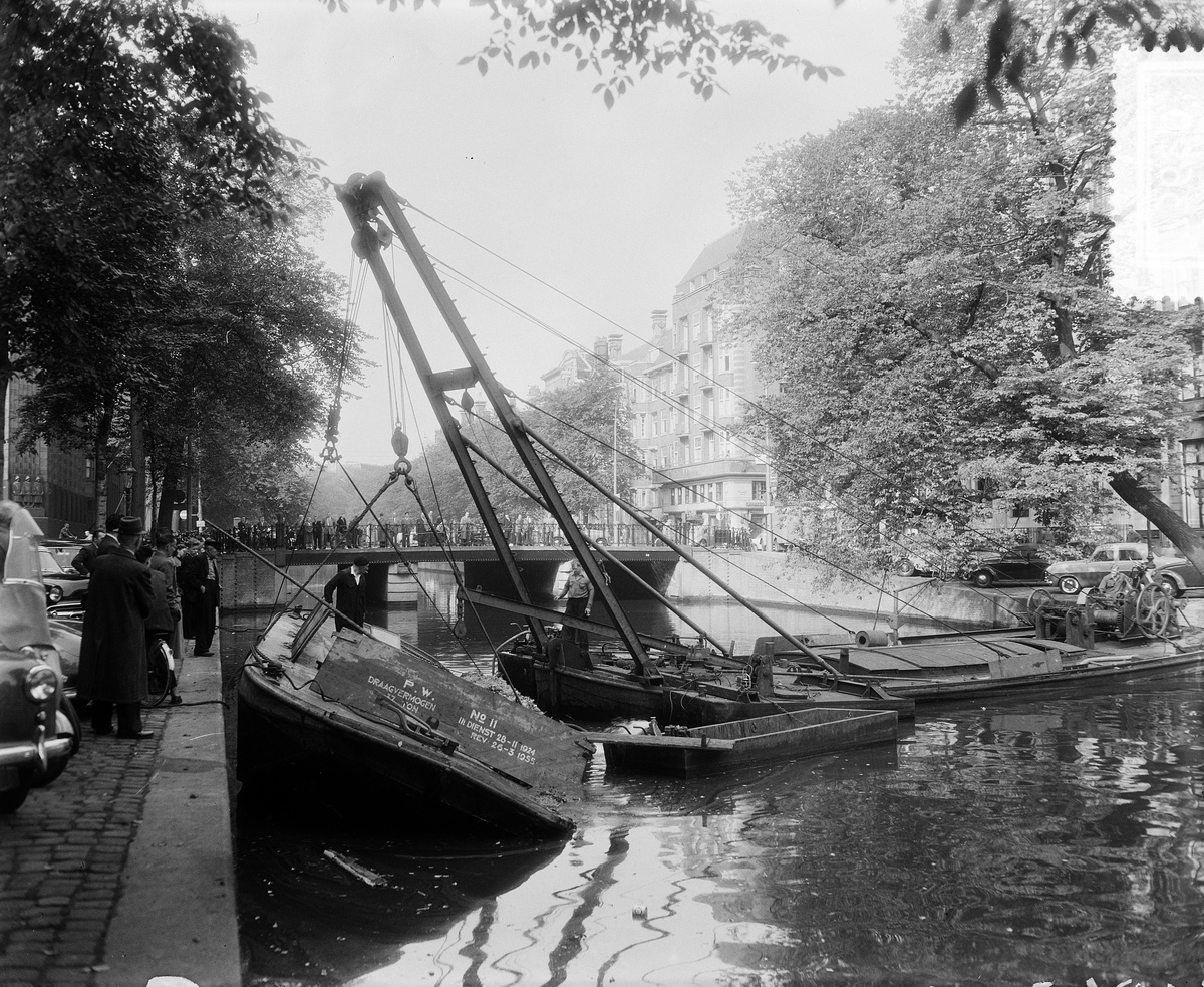 Een berging van een dekschuit van publieke werken in de Amsterdamse grachten.