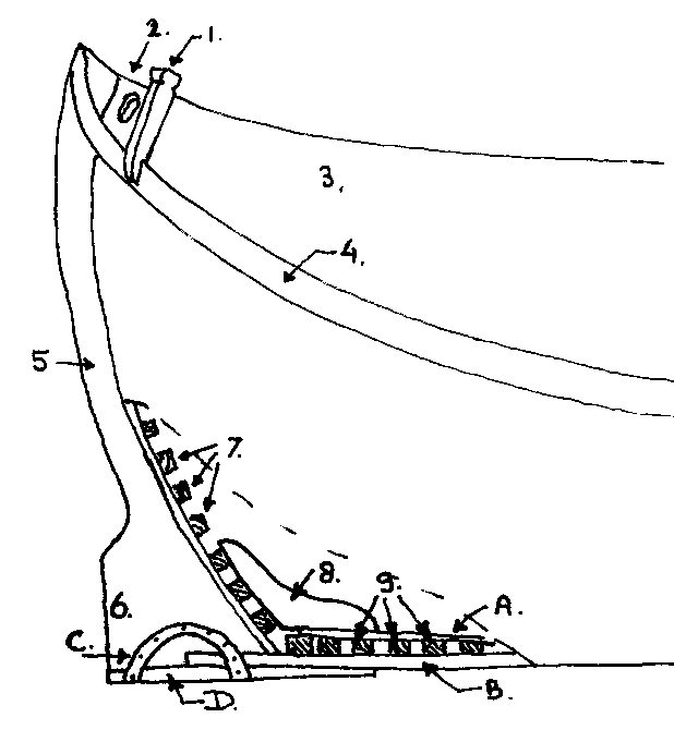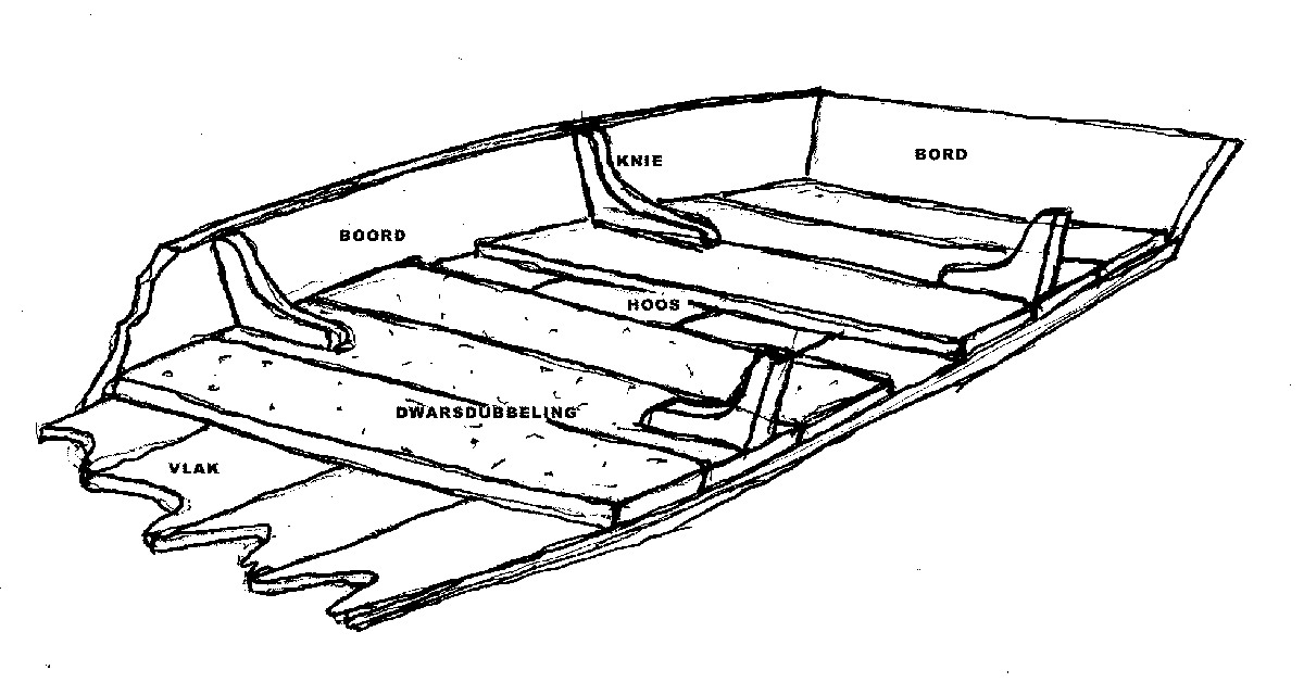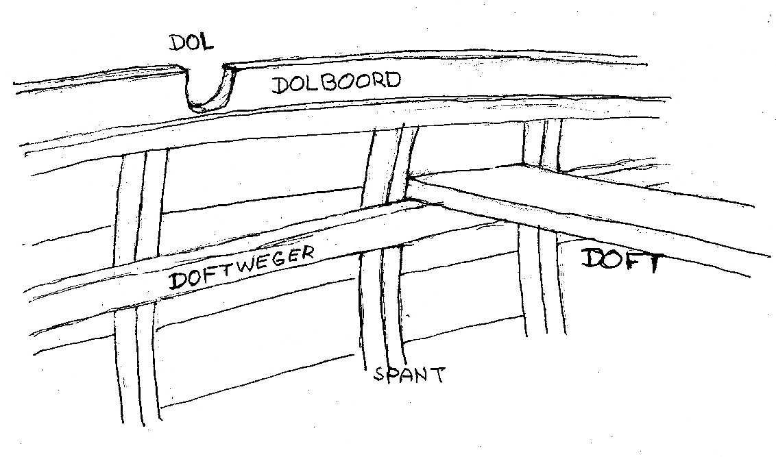 In het voorschip, tussen het bovenste kussen en de dekwegers, (zie pijlen) zijn vaak een paar zware houten knieën aangebracht. Soms wordt er echter één doorlopend stuk het