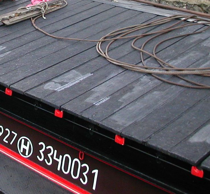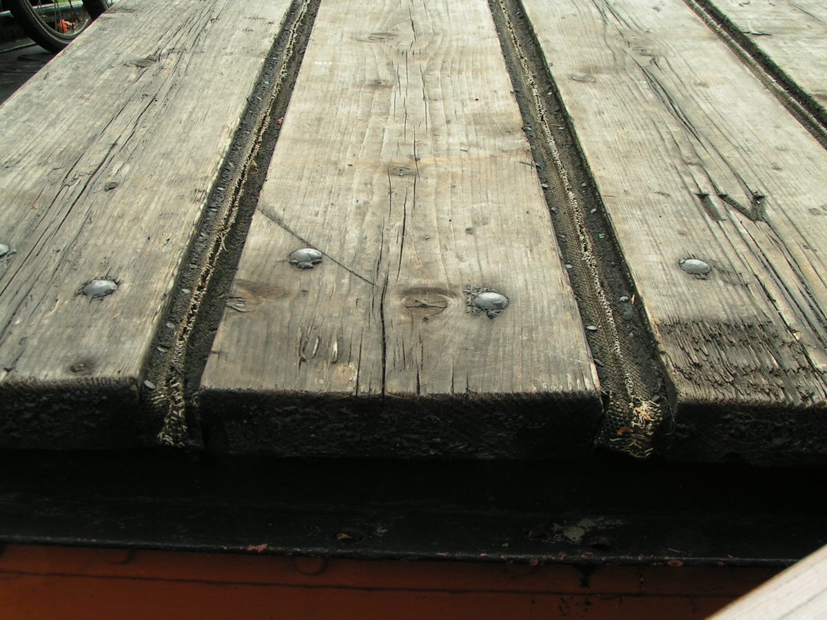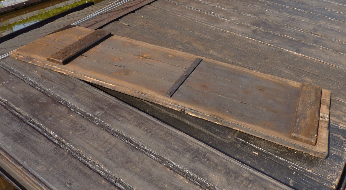 Normaal zijn de klampen aan het luik geklonken, bij deze luikenkap zijn ze gespijkerd. Dat de middelste klamp een stalen strip is, komt vaker voor. De onderste klamp is meestal van eikenhout en wordt pas als de luiken op het schip gepast zijn, vastgezet.