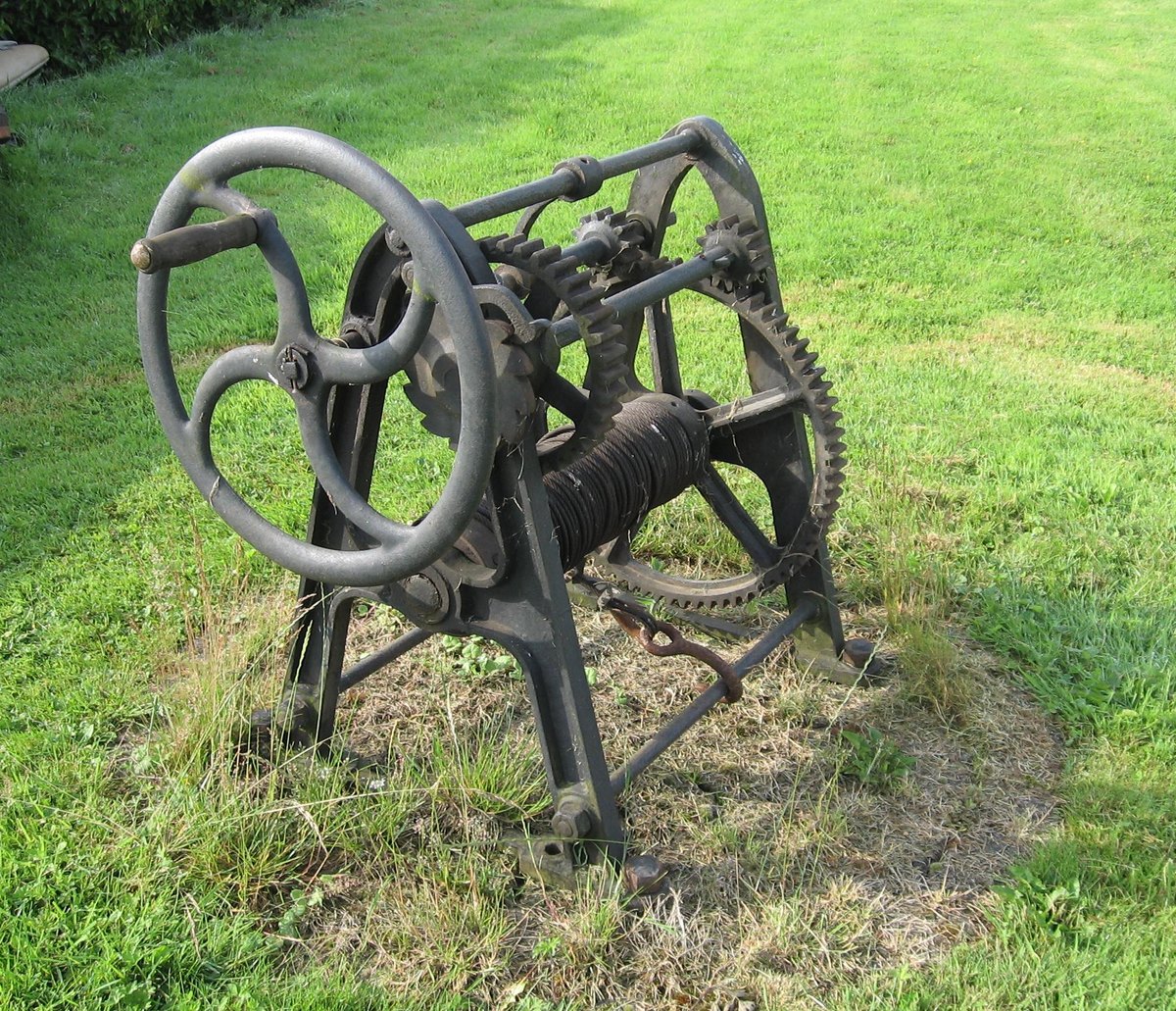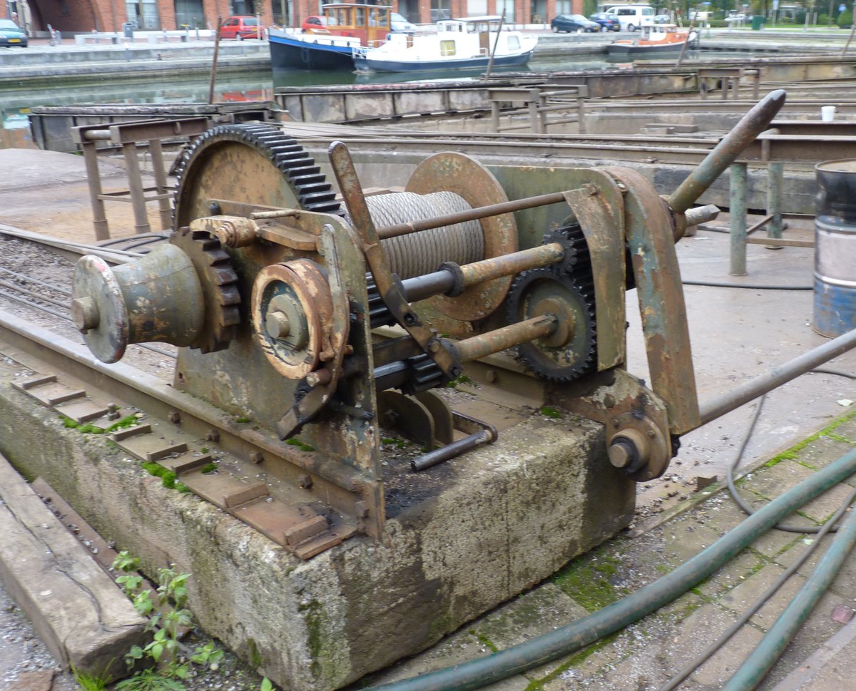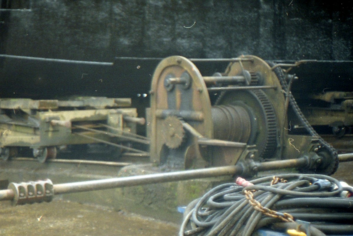 mechanisch aangedreven lier gebouwd is. Rechtsonder de centrale as waarmee alle lieren tegelijk aangedreven kunnen worden. Individuele bediening van de lieren is mogelijk.