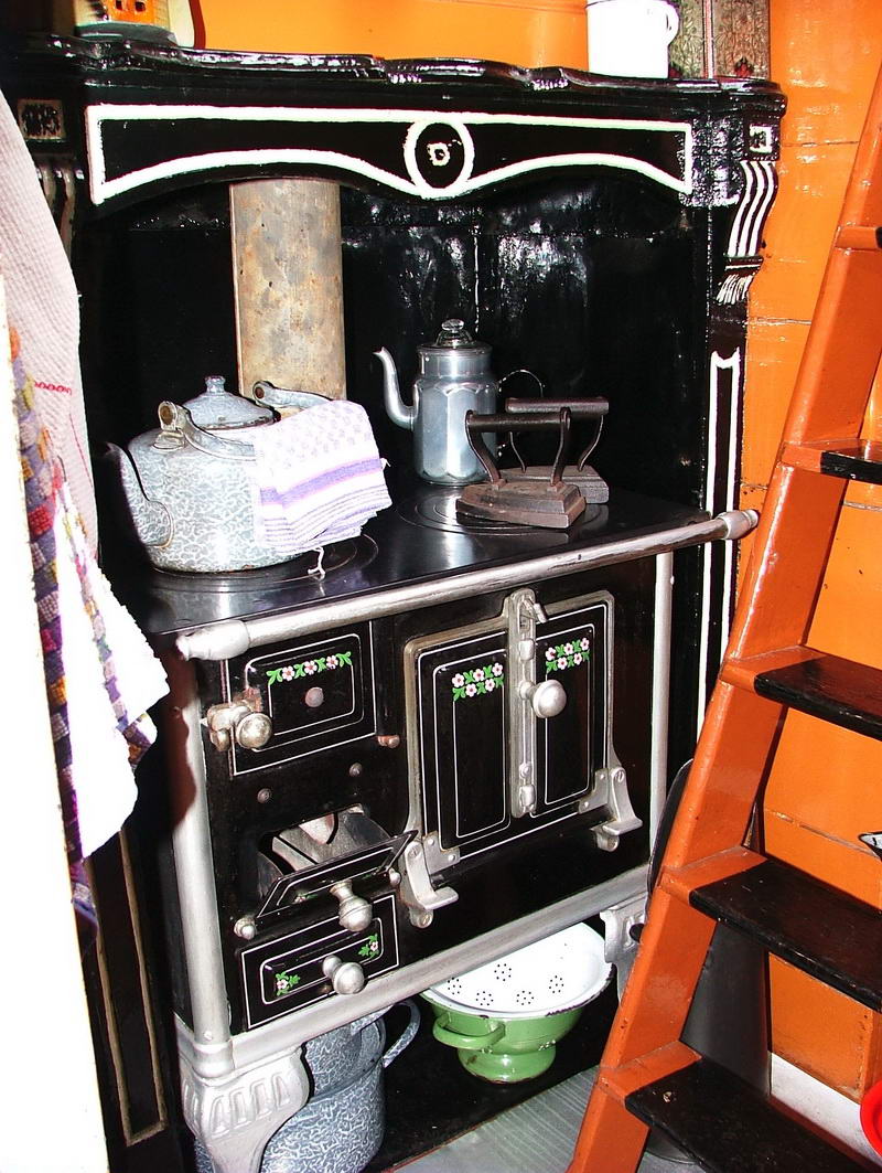 Het kolenfornuis in de woning van de 'Annigje'. Via de trap komt men op het achterdek.