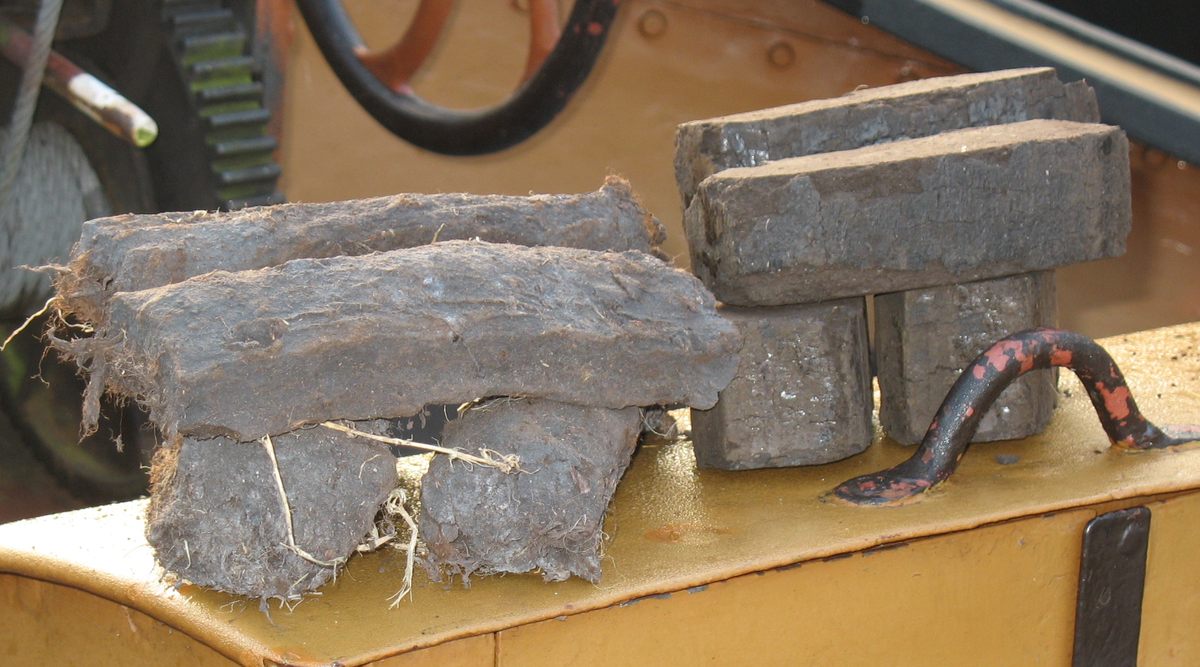 gebruikt voor verwarming. Links gewone turven, rechts tot briketten geperste turven.