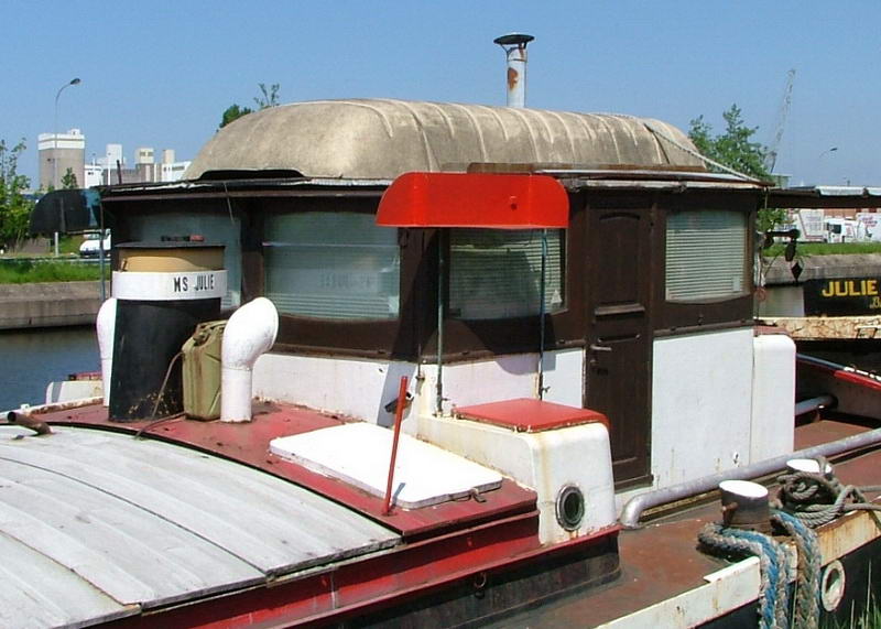 De stuurhut en de uitlaat van de motor.