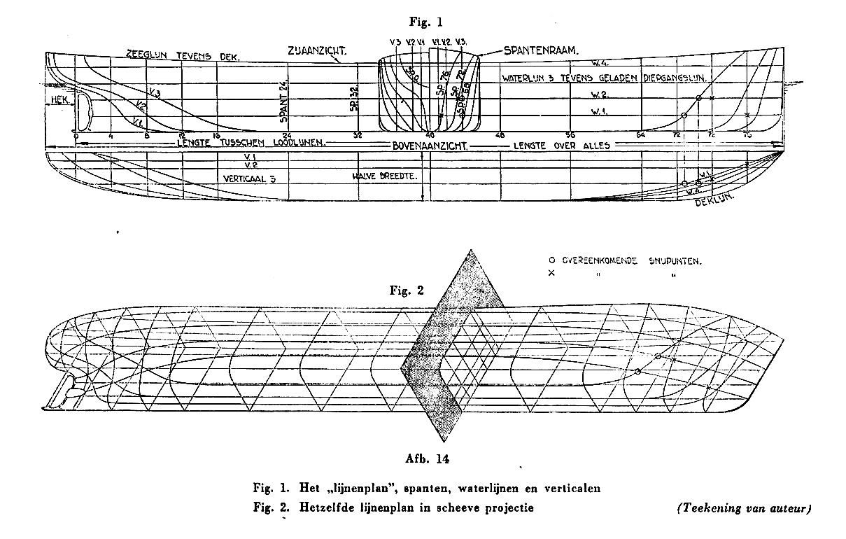 | De onderste tekening geeft het zijaanzicht. - de gebogen lijnen, m.u.v. de lijnen, die buiten de romp vallen, vertikalen. - de vertikale lijnen zijn spanten, - de horizontale waterlijnen. |