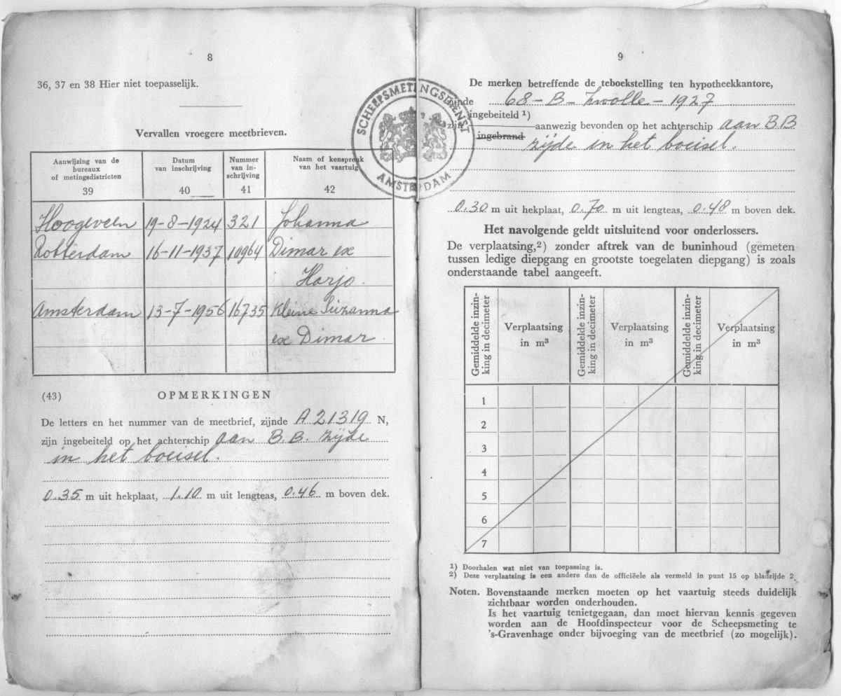 (De hermeting van 1937 kan een indicatie zijn dat toen mast, zwaarden, lieren e.d. verdwenen. Ook