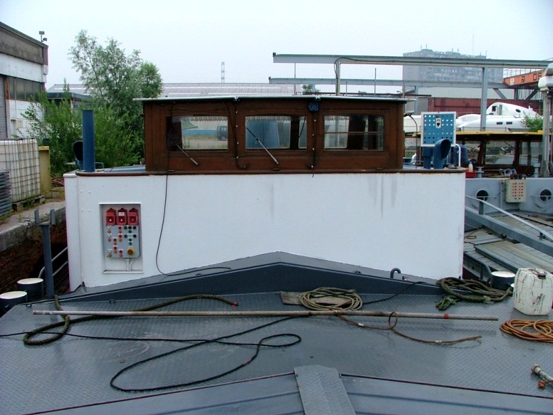 Vooraanzicht van de stuurhut van de Mousson. Hier is nog net te zien dat een gedeelte van deze zwaveltanker nog steeds met een houten
