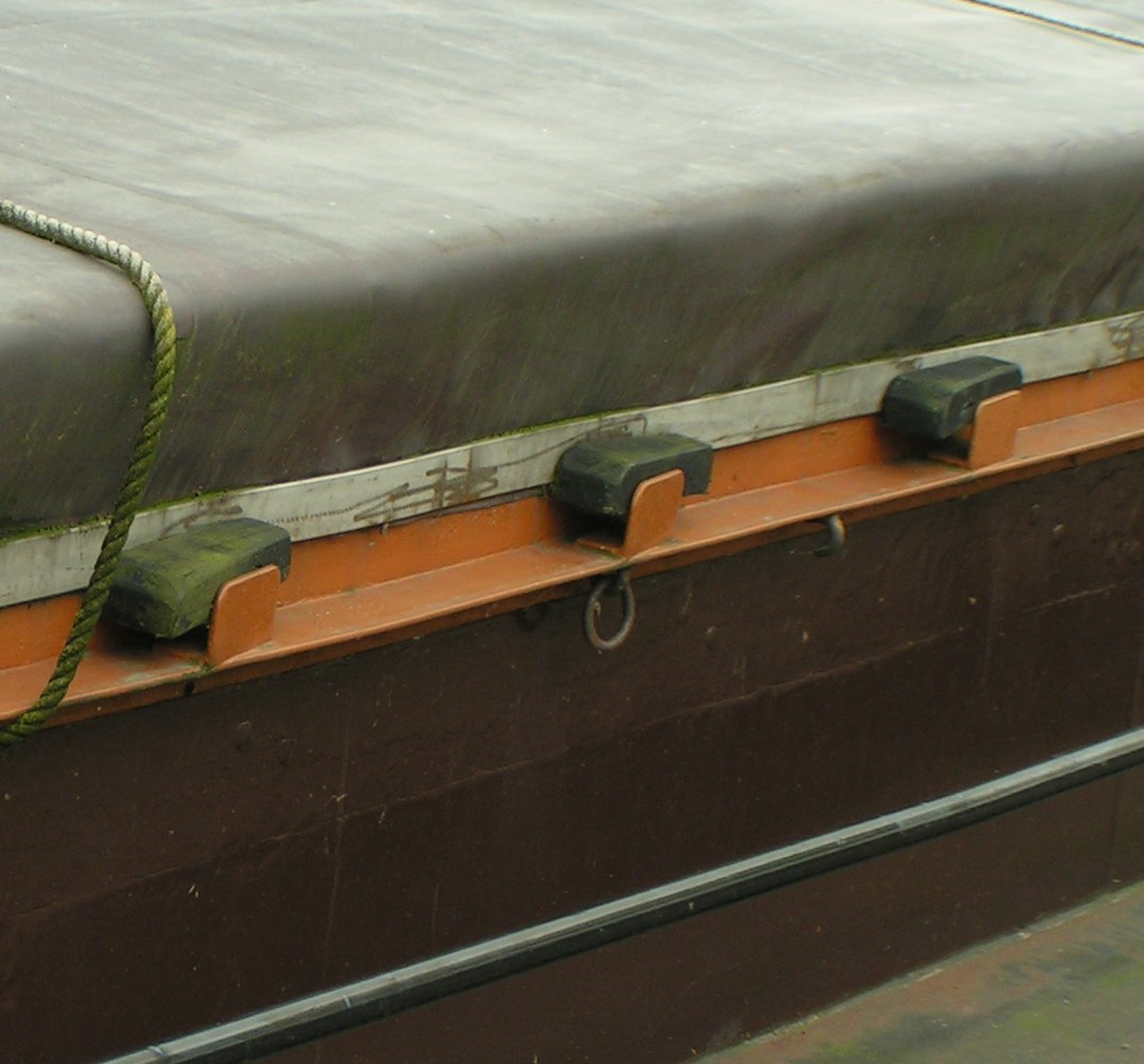 Bij deze luikenkap kunnen er twee mogelijkheden van verzegelen van toepassing zijn. Men rijgt, om en om, een zegeldraad door de zegelringen (6) en door de met blik versterkte gaten in het uiteinde van het luik (12). De andere mogelijkheid is, dat men zegelbouten door de gaten (12) stak en dat deze tevens door gaten in de hoeklijn daaronder (14) staken. In dat geval is die hoeklijn dus een zegellijst. Door de uiteinden van de zegelbouten werd dan een zegel of een zegeldraad aangebracht. De zegelringen (6) zijn dan overbodig geworden.