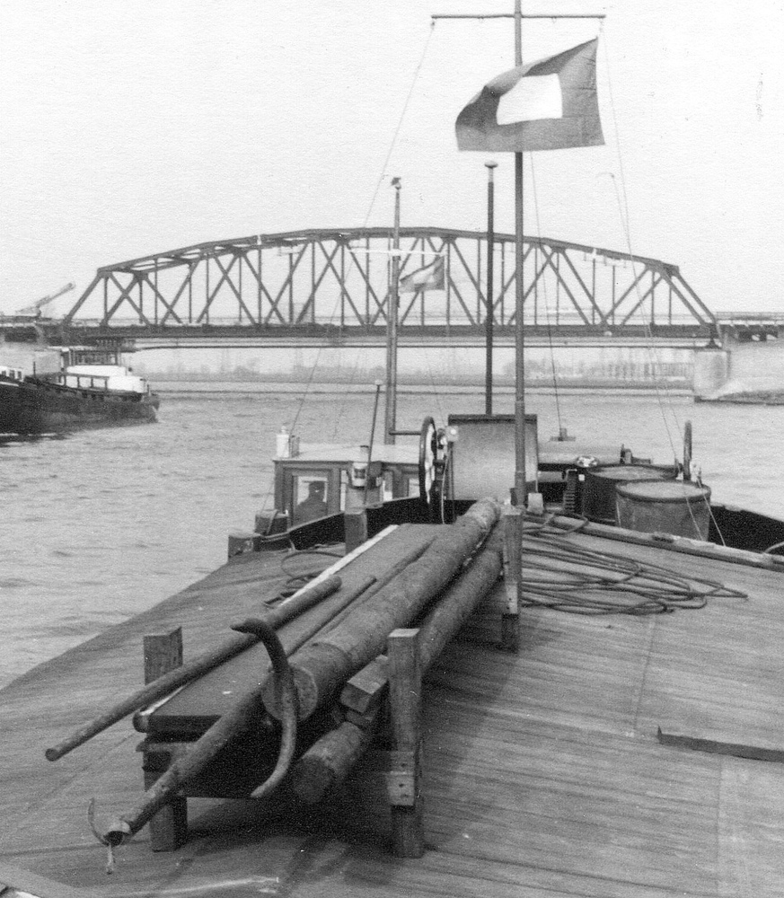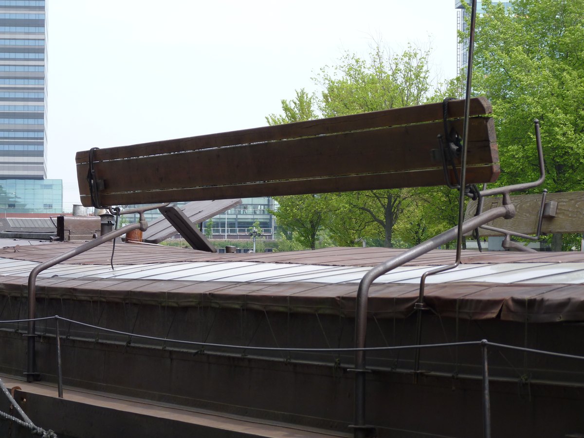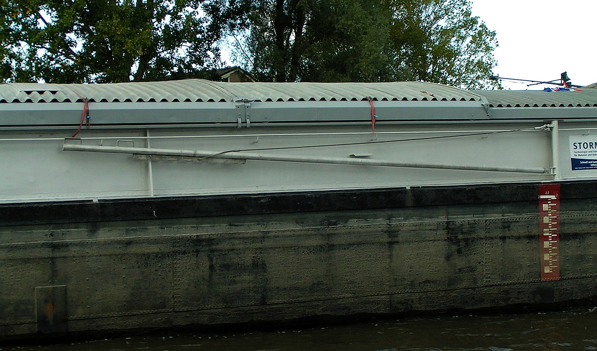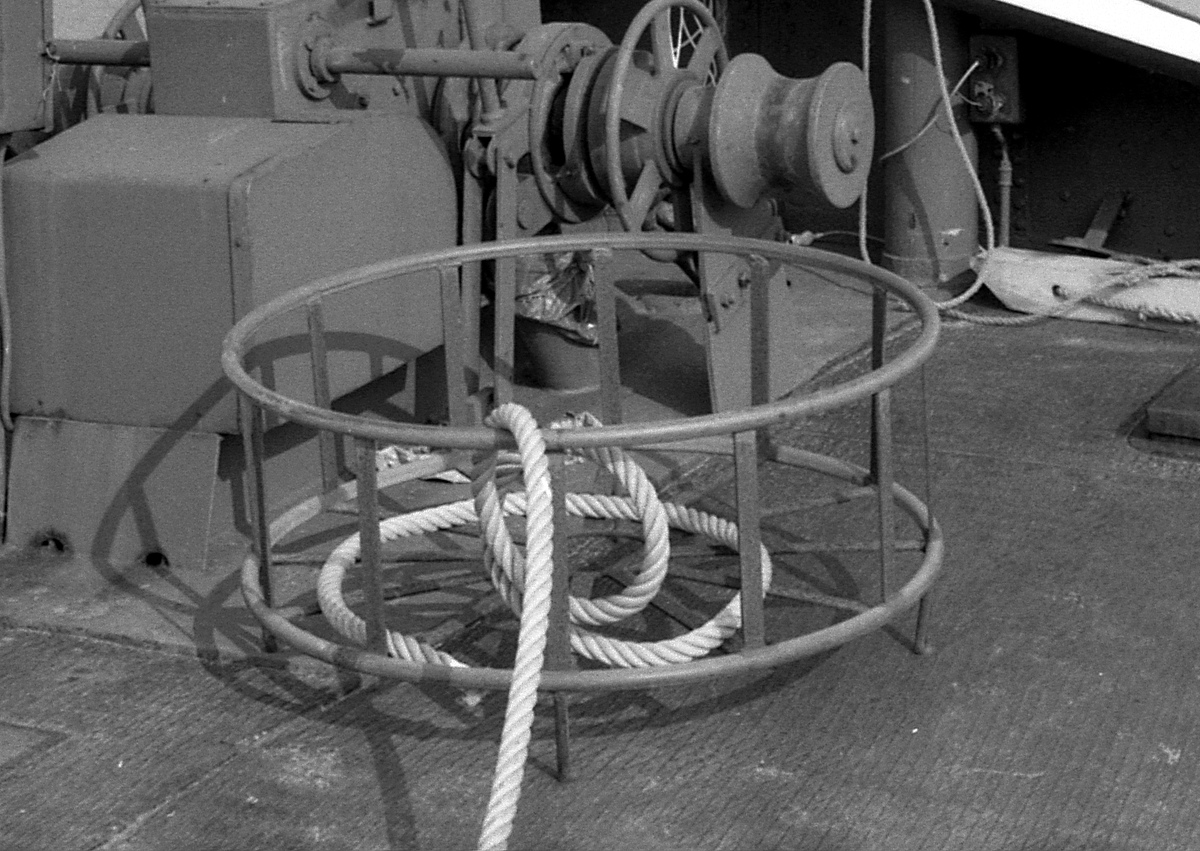 boord te komen. Het uiteinde van de boom wordt met een staaldraad, die aan de bovenzijde van de den of zoals hier aan een korte mast, bevestigd is, omhoog gehouden. Vervolgens gaat men over het uiteinde van de boom hangen en geeft zich zelf een flinke zet, waardoor de boom buitenboord zwaait en men, hopelijk, de wal kan bereiken. Wilt men terug, dan zal een ander de boom buitenboord moeten duwen, waarna men weer