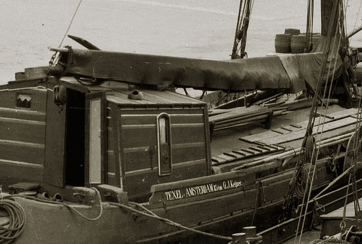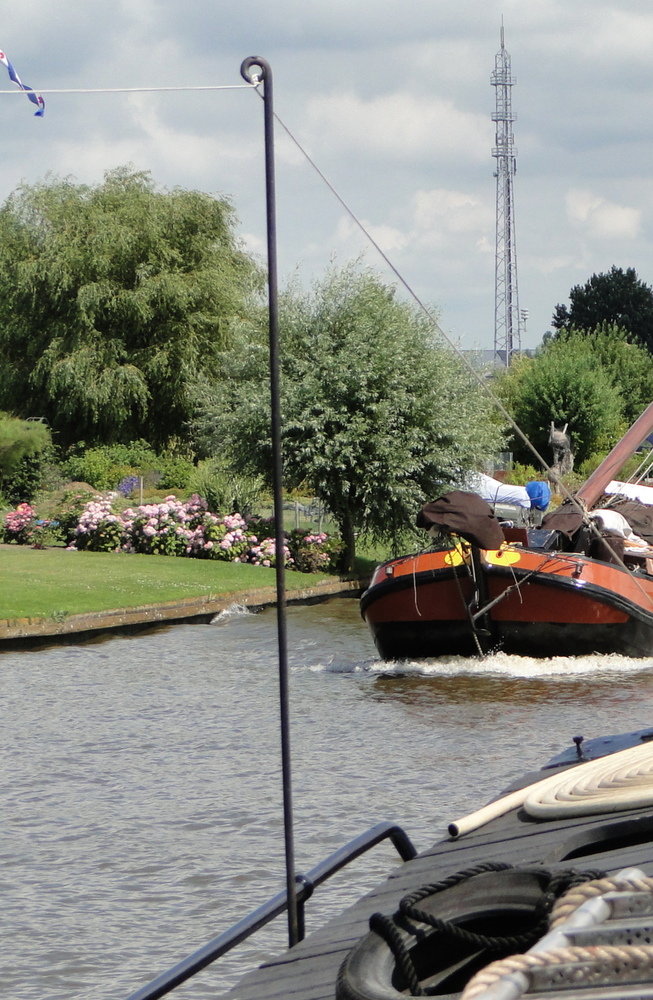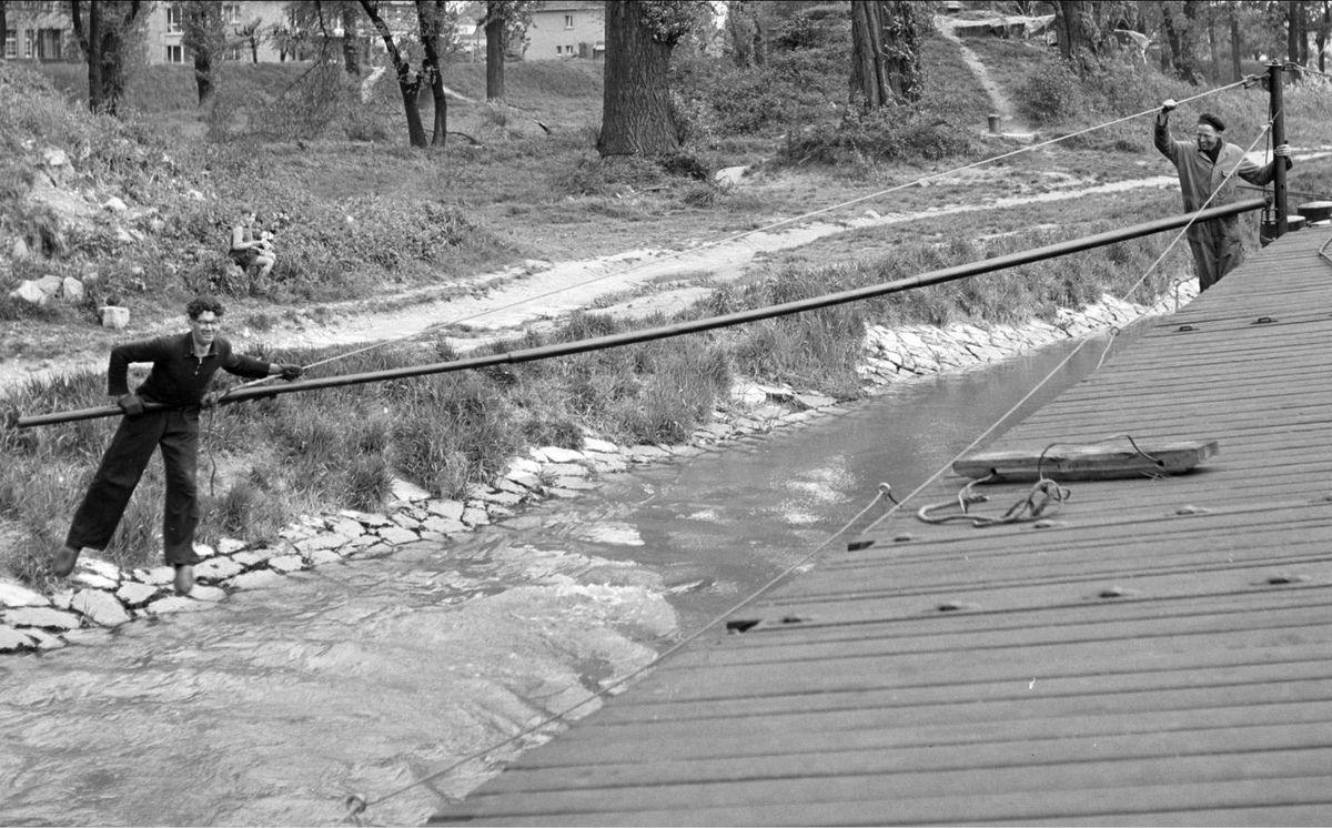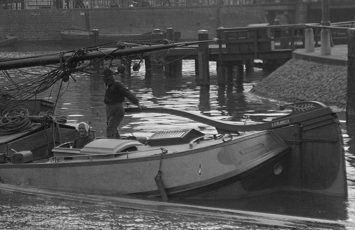boord te komen. Het uiteinde van de boom wordt met een staaldraad, die aan de bovenzijde van de den of zoals hier aan een korte mast, bevestigd is, omhoog gehouden. Vervolgens gaat men over het uiteinde van de boom hangen en geeft zich zelf een flinke zet, waardoor de boom buitenboord zwaait en men, hopelijk, de wal kan bereiken. Wilt men terug, dan zal een ander de boom buitenboord moeten duwen, waarna men weer