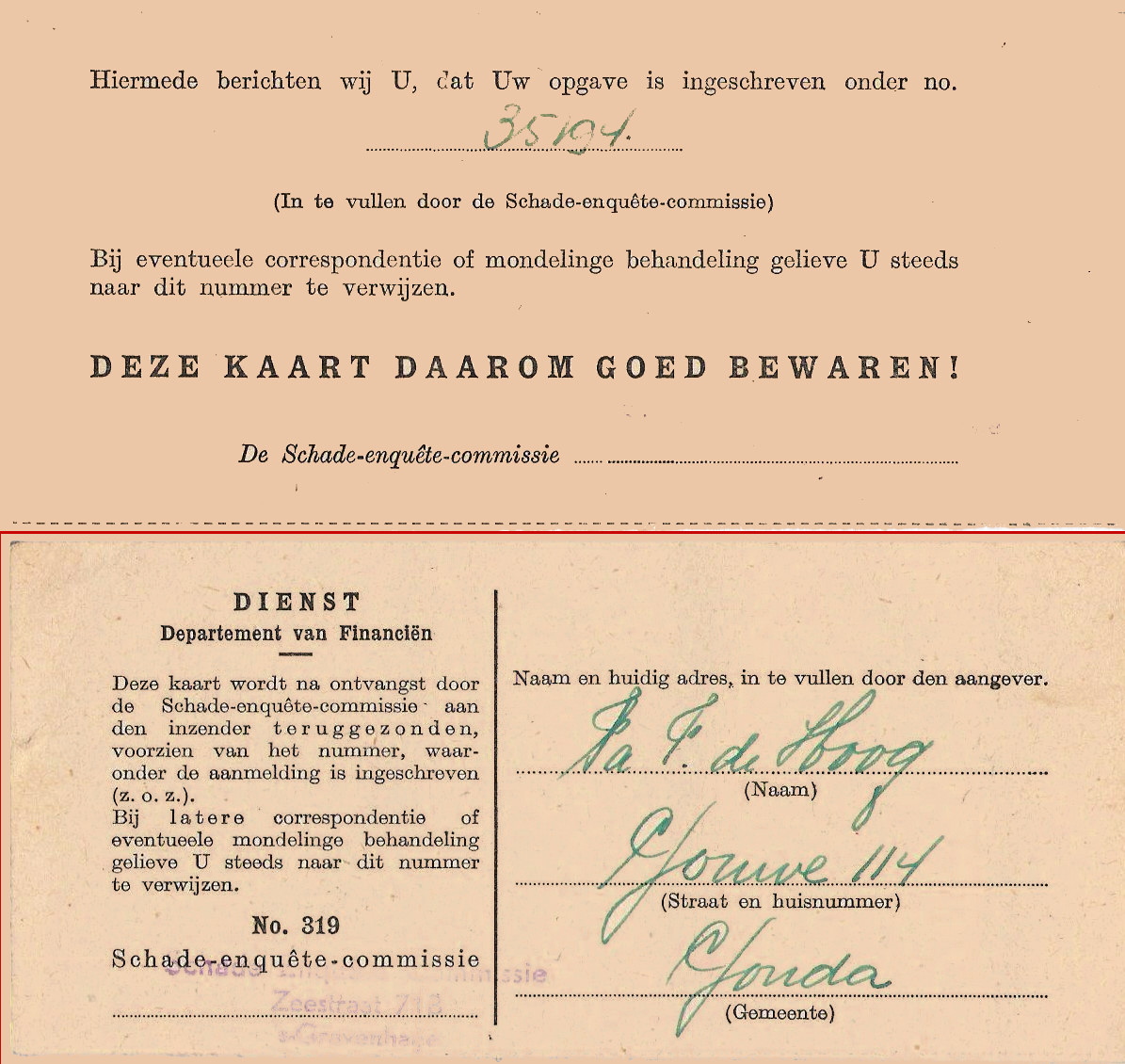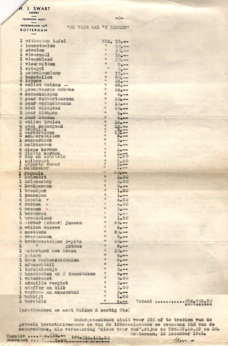 Een brief van 17 november 1947 vermeldt dat de inboedelschade niet door