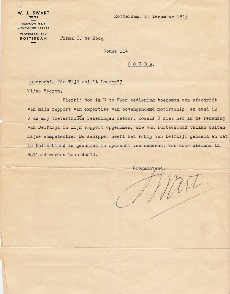 De brief van Dhr. J. W. Swart aan de firma De Hoog is geschreven op een