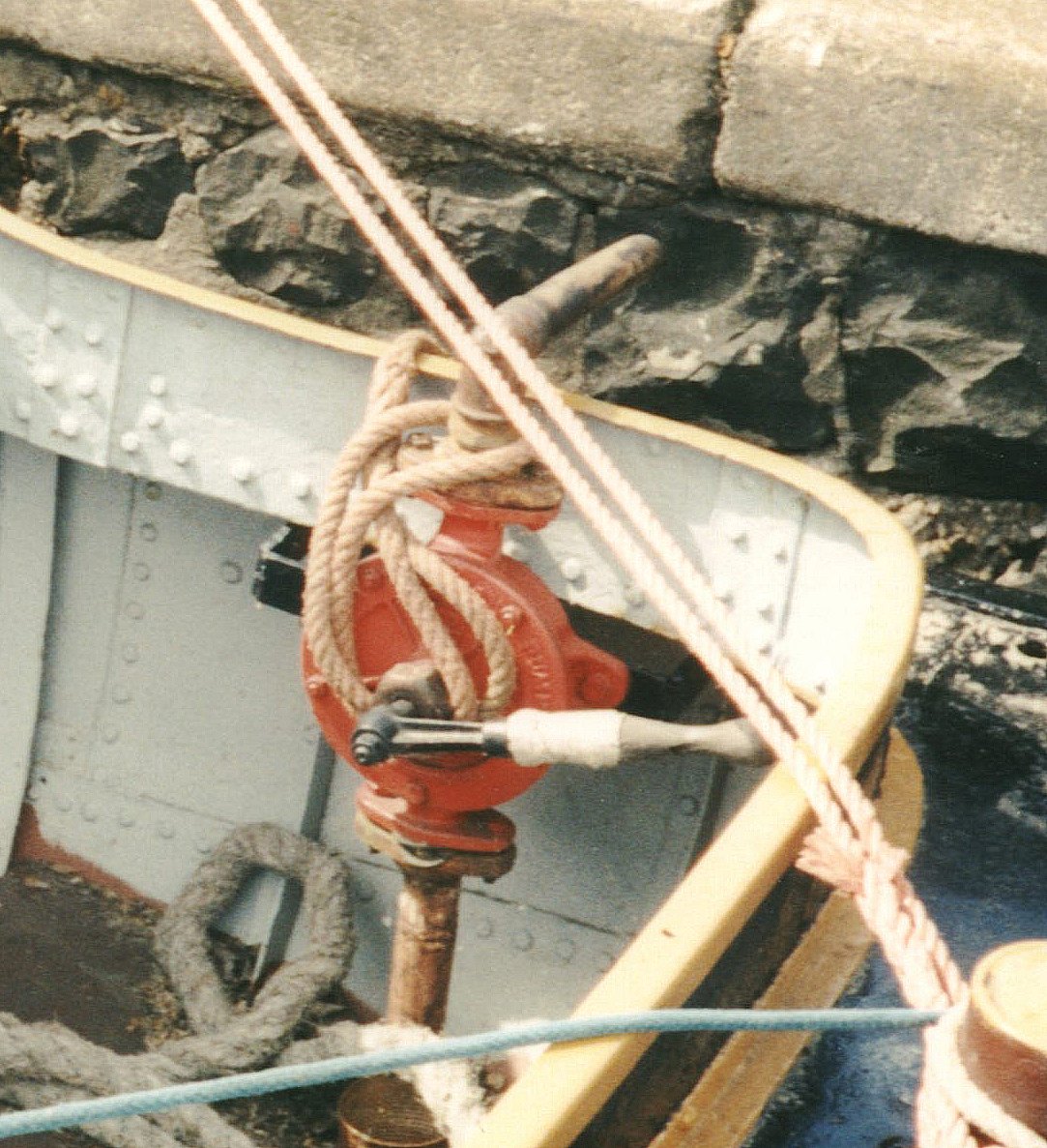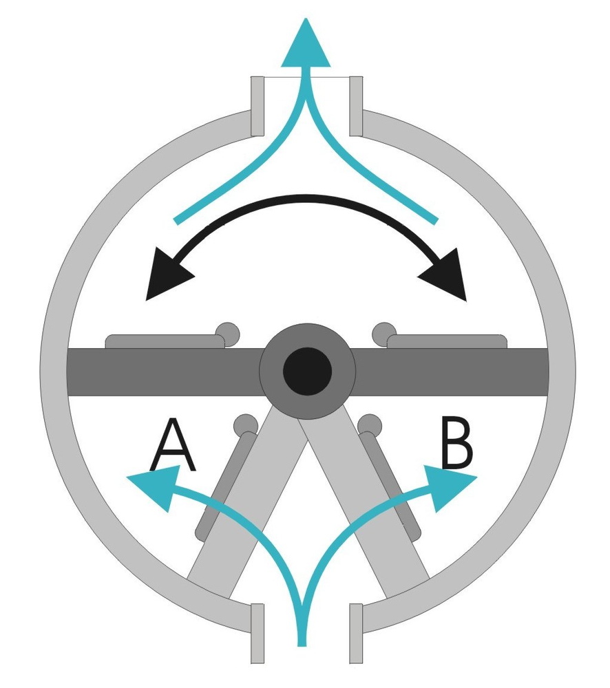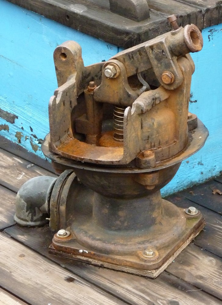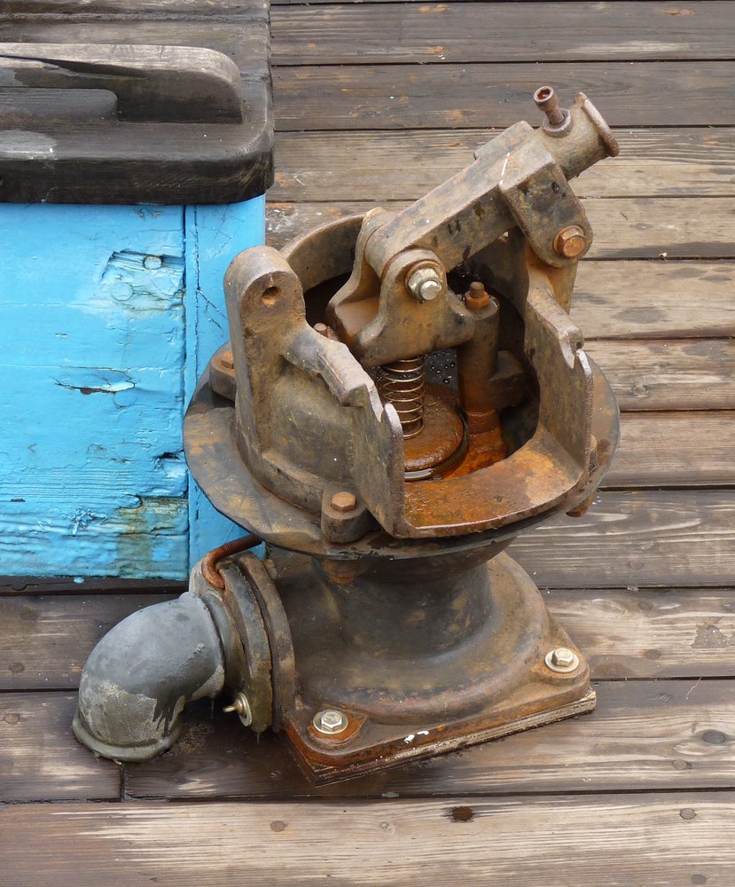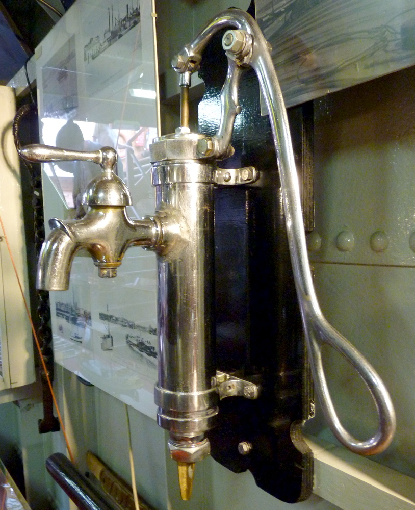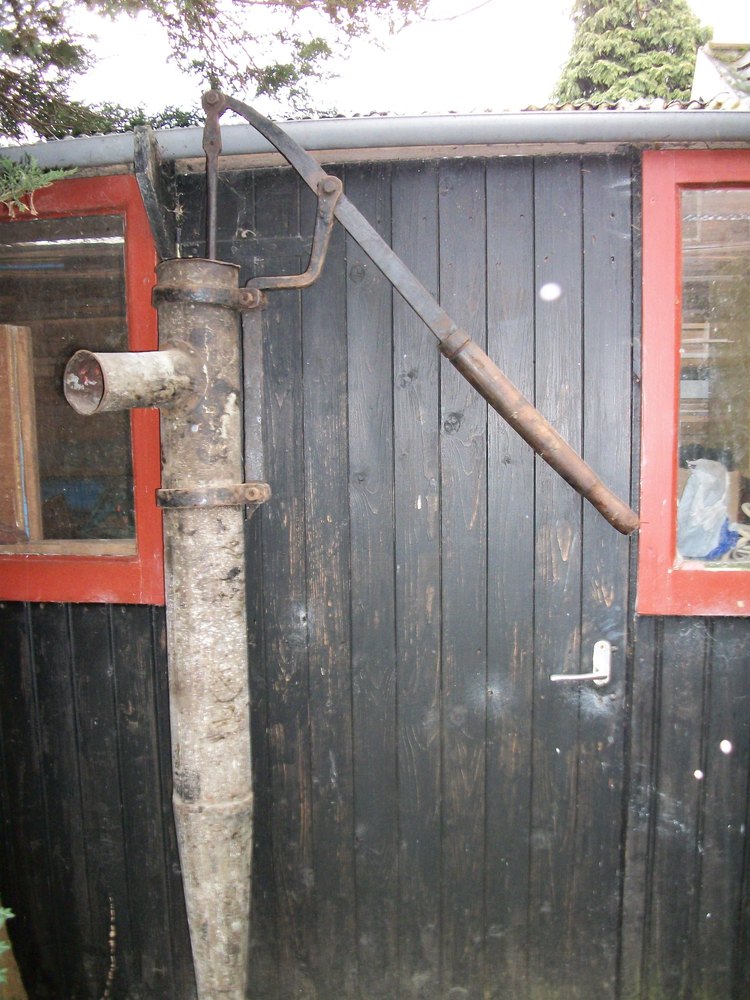 kattekop ingericht voor handbediening. De kleppen in dergelijke pompen bestonden vaak uit harde rubberen ballen. In dit geval is de, met veer bkrachtigde, bovenklep een, met metaal verzwaarde, rubberen schijf.