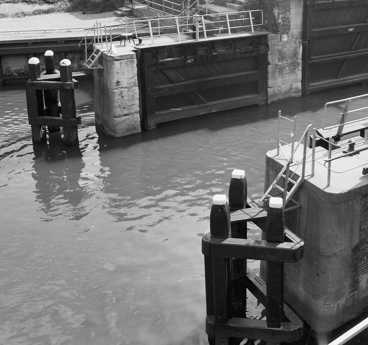 geleidewerk genoemd te worden. Bij deze sluis vallen de deuren, zoals te doen gebruiklijk, wel geheel binnen de deurkassen.
