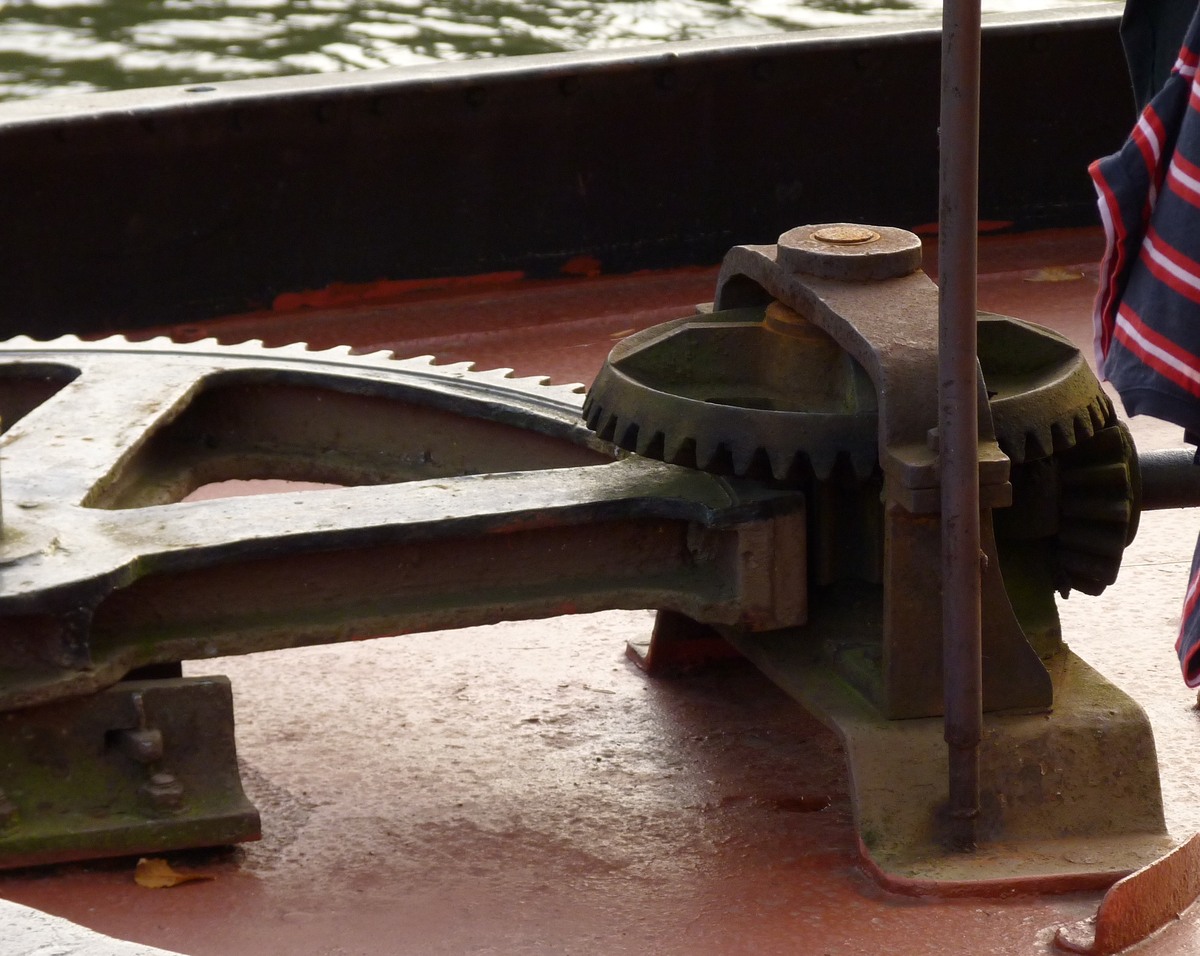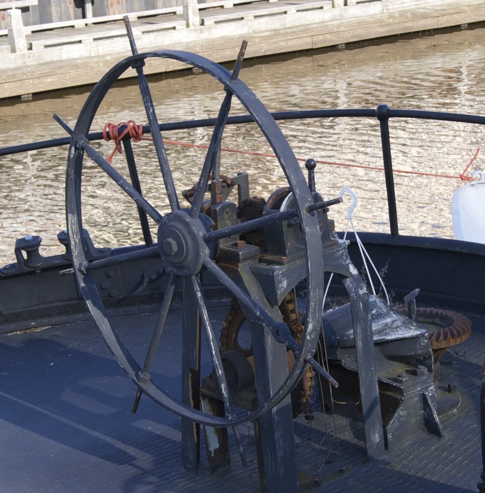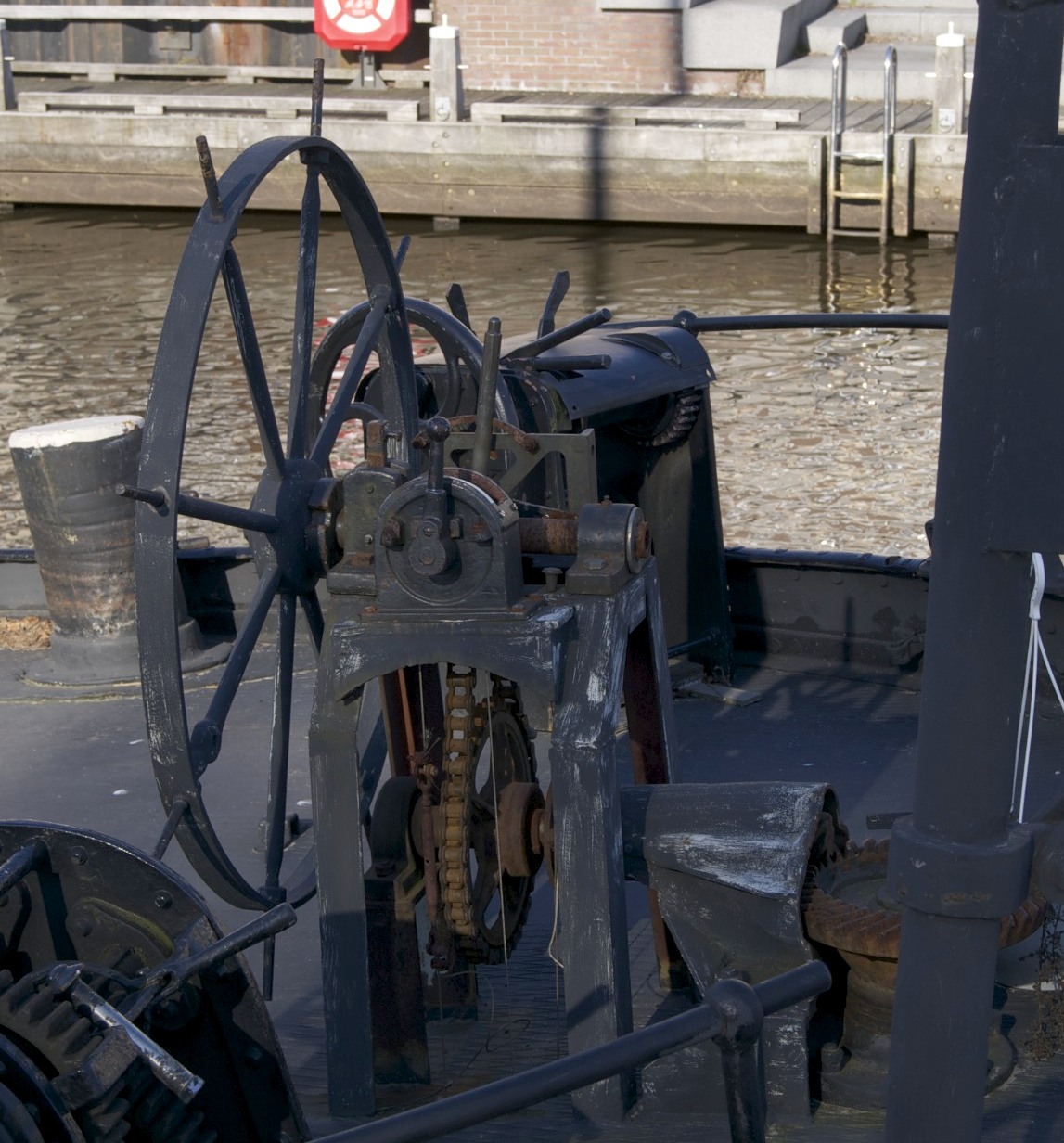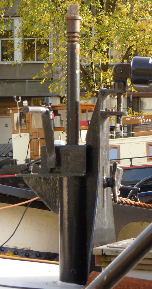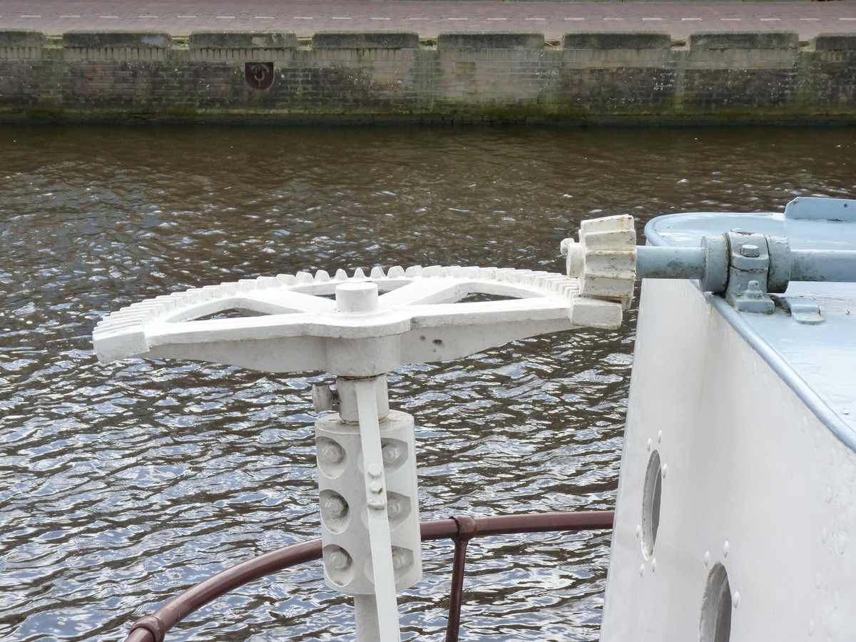 en daarmee het hele stuurhuis omhoog of naar beneden draaien. Daarna wordt de stuurhut op de gewenste hoogte vastgezet, de spie terug geplaatst en de tandwielen weer vrijgegeven. Het