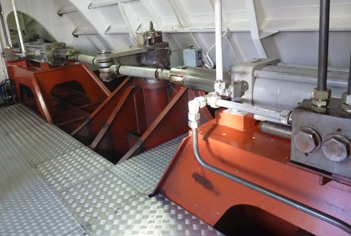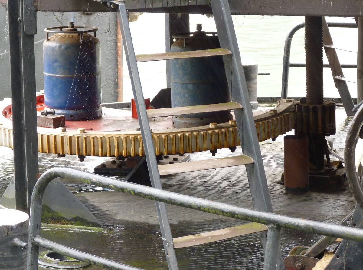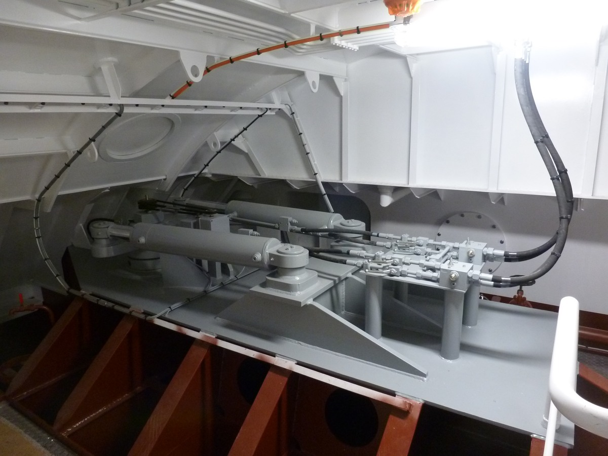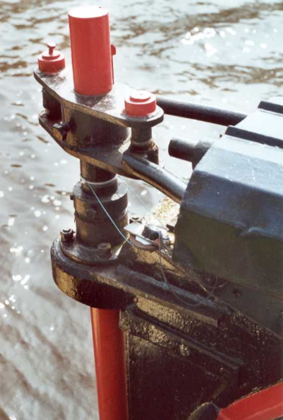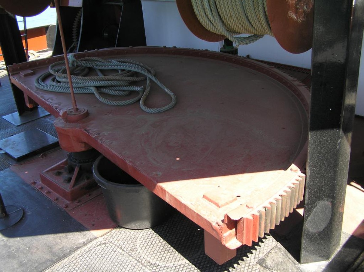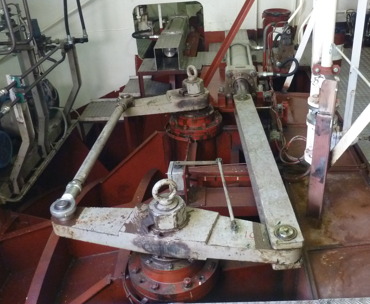 en daarmee het hele stuurhuis omhoog of naar beneden draaien. Daarna wordt de stuurhut op de gewenste hoogte vastgezet, de spie terug geplaatst en de tandwielen weer vrijgegeven. Het