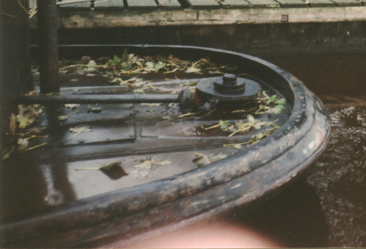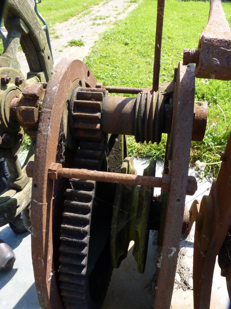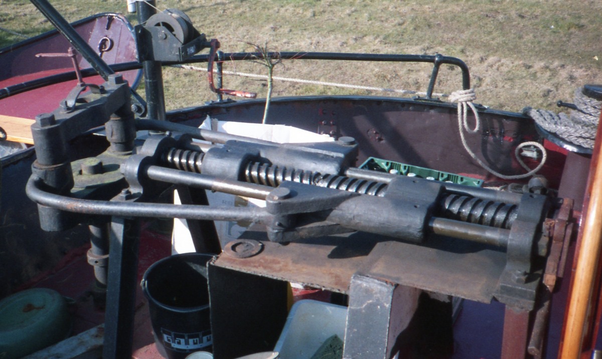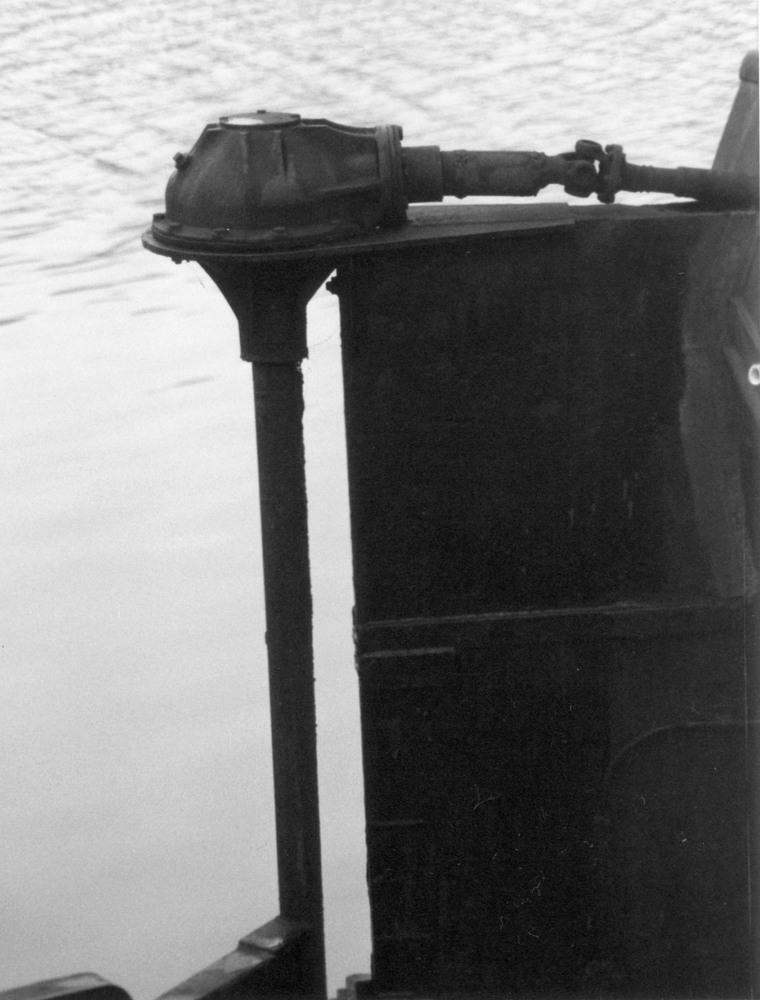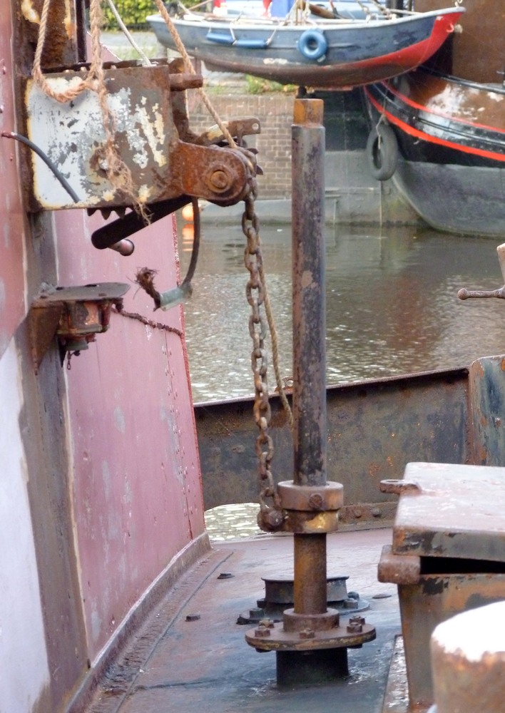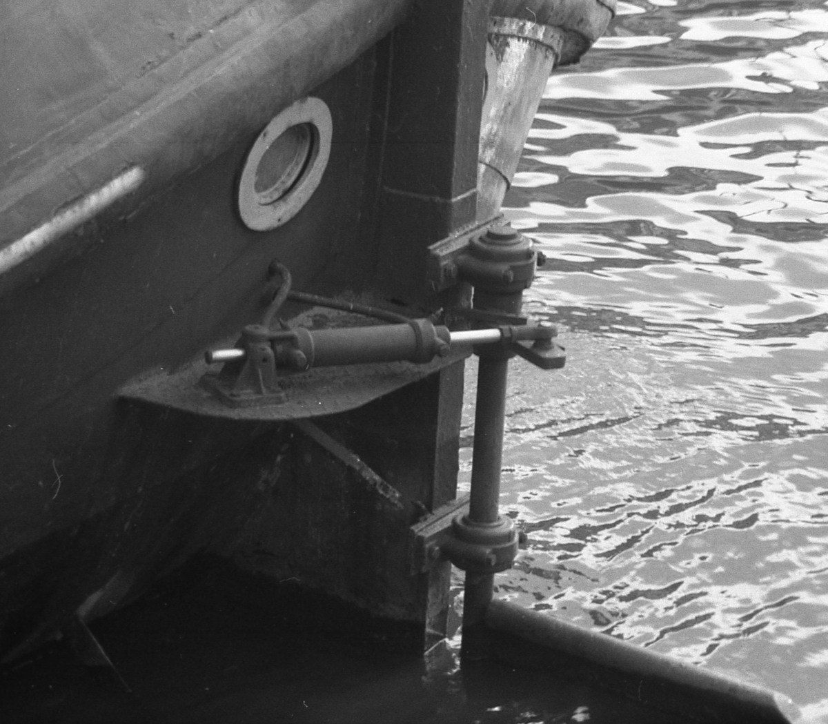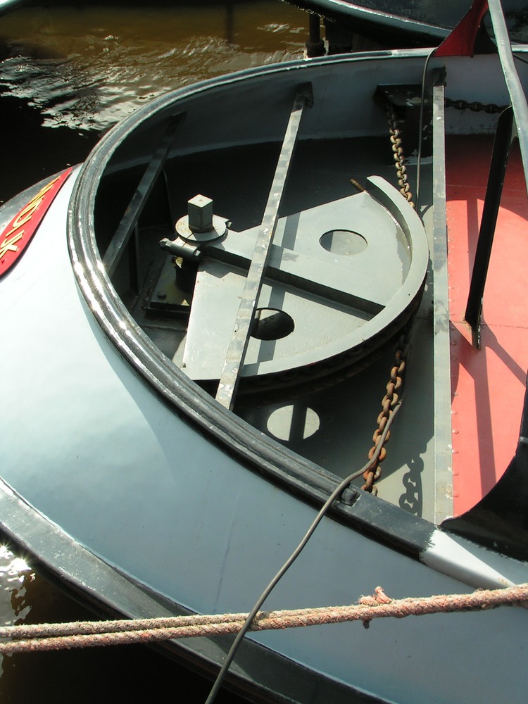 en daarmee het hele stuurhuis omhoog of naar beneden draaien. Daarna wordt de stuurhut op de gewenste hoogte vastgezet, de spie terug geplaatst en de tandwielen weer vrijgegeven. Het