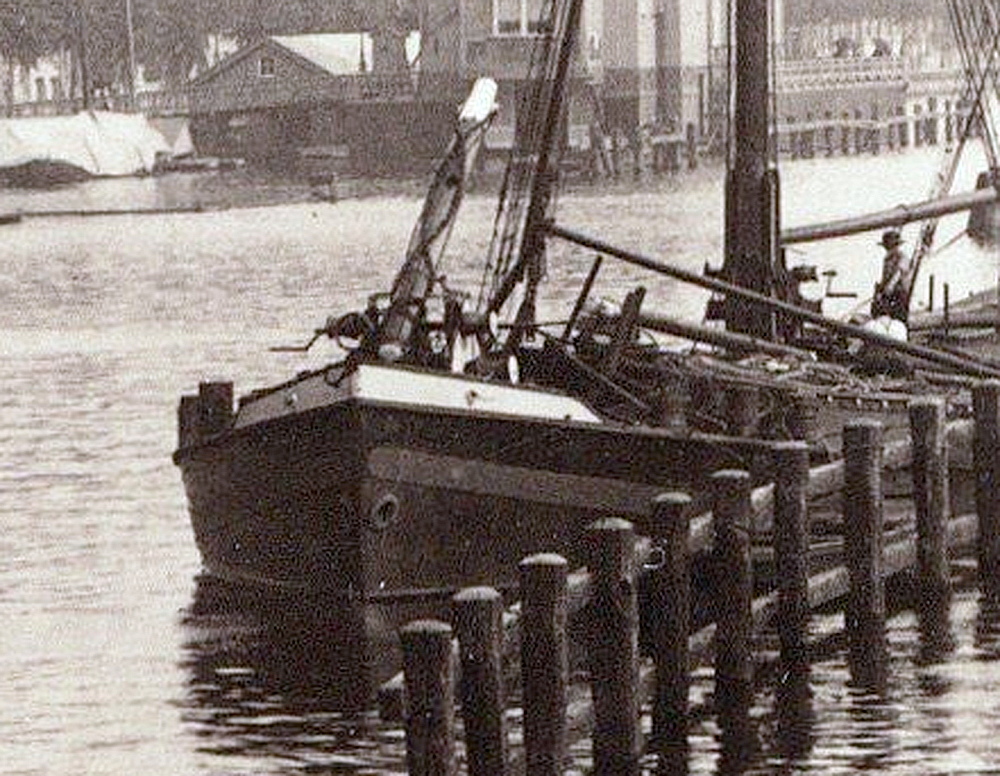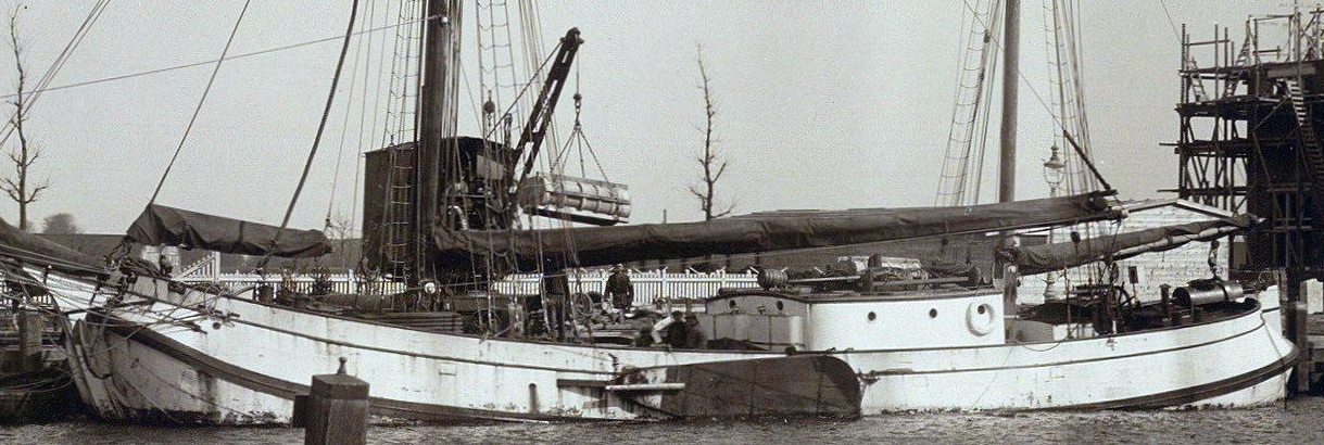 Fototitel: De koftjalk 'Ambulant' van H.Groen uit Groningen bouwjaar 1909 in de haven van de Zuidergasfabriek op de Korte Ouderkerkerdijk (Amsterdam).
