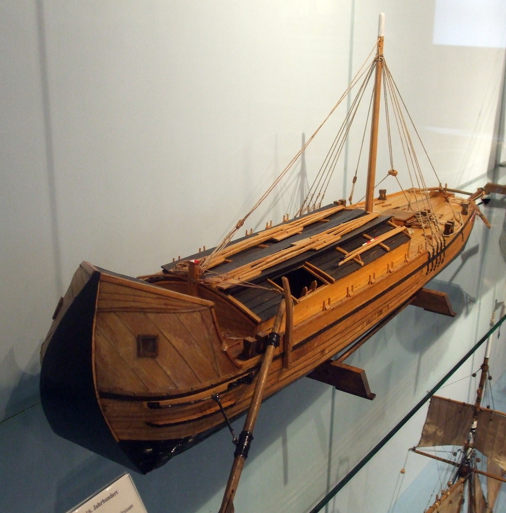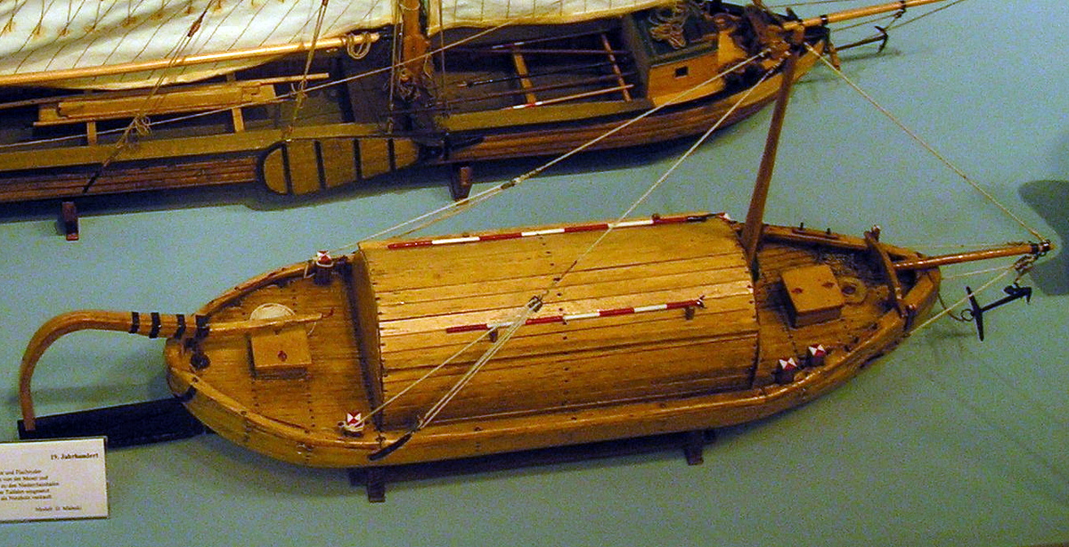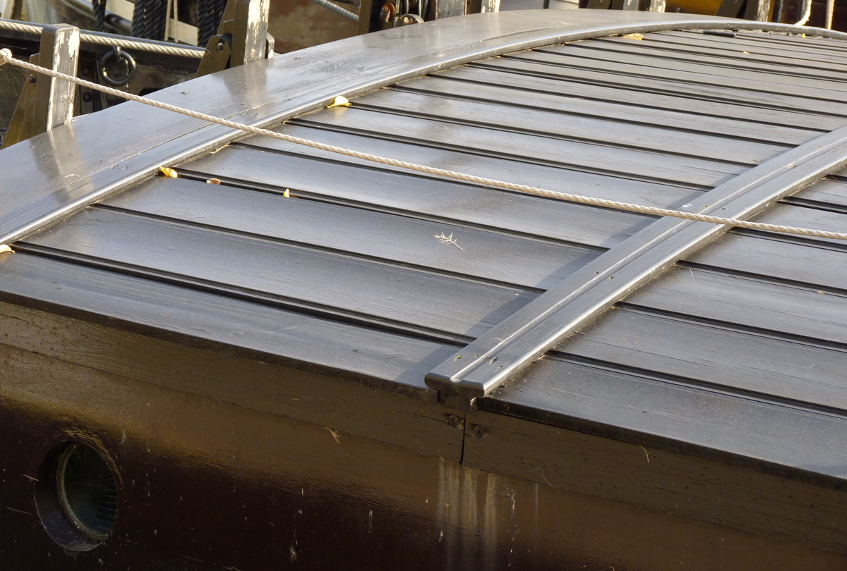 De hoge ronde luikenkappen vond men veel op schepen die lichte goederen vervoerden, zoals op dit uit Duitsland afkomstige, negentiende eeuwse,