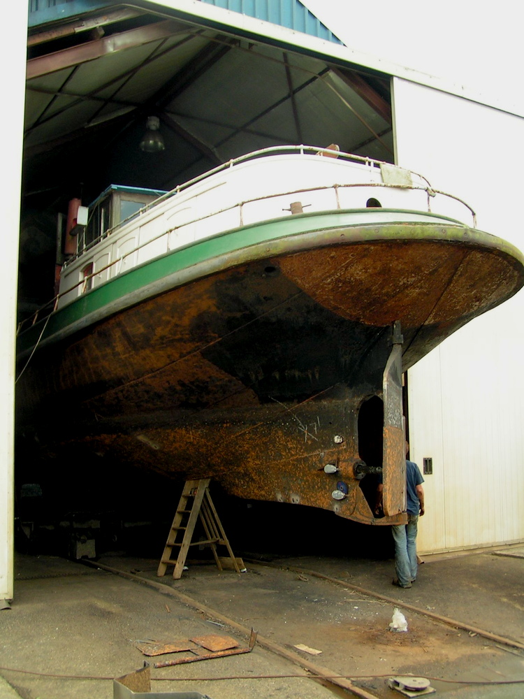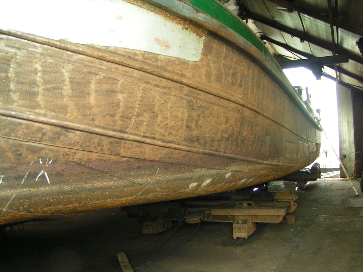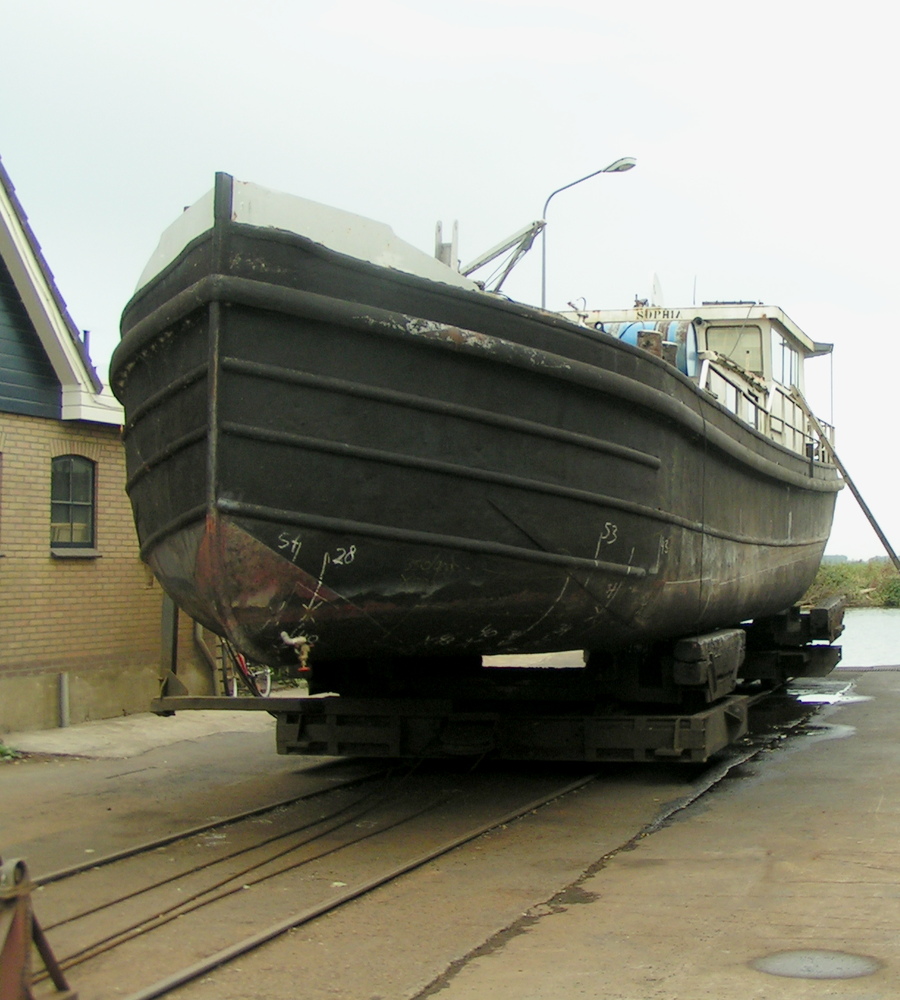 ligt. De stang wordt zo gezet dat wanneer het schip net niet tegen de stang aan ligt, het schip midden boven de kar is. De achterste kar moet ongeveer bij het