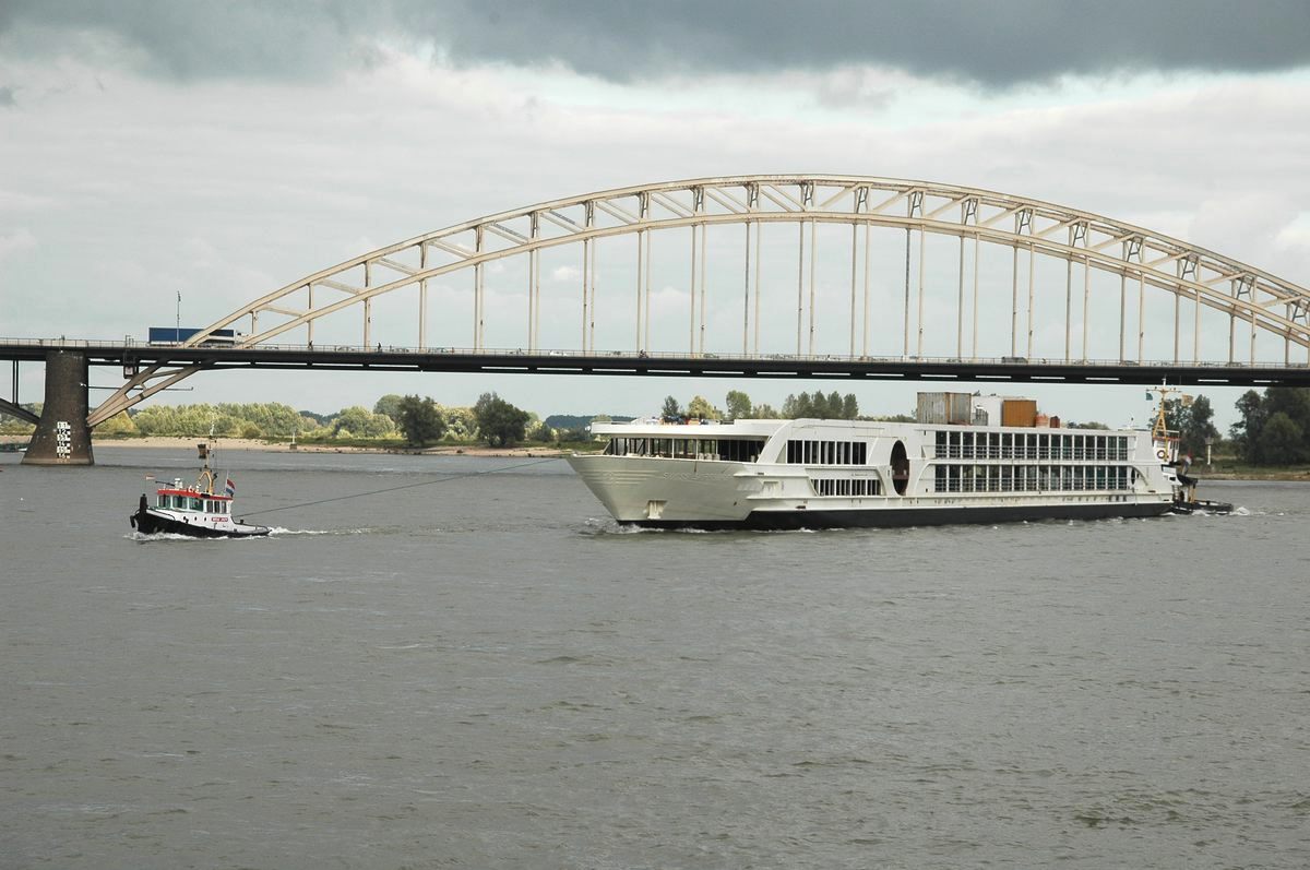 Een onbekende sleepboot aan de achterzijde fungeert als 'dynamisch roer'.