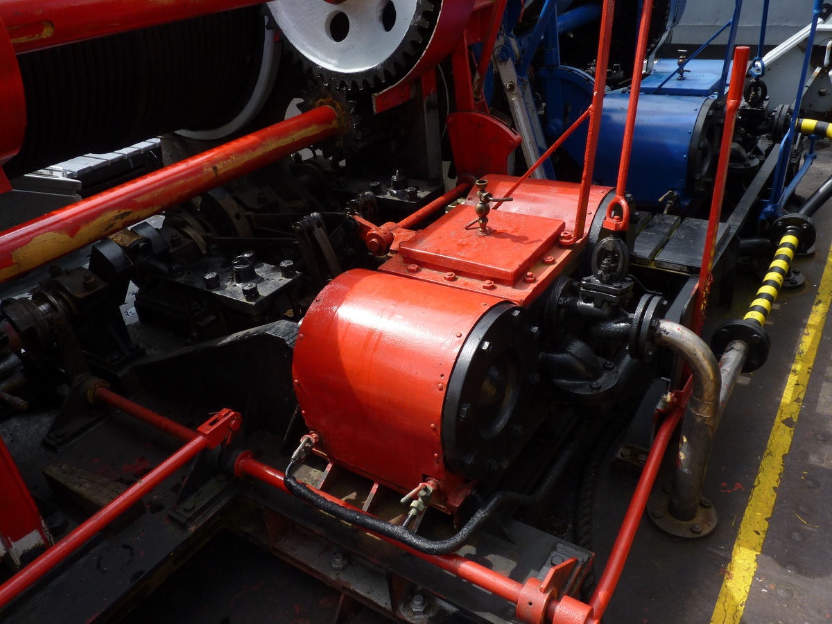De cilinders (rood en blauw) van de stoommachines van een hijslier op een bok. Bokken zijn lang stoom blijven gebruiken omdat een stoommachine niet hoeft te draaien om kracht te leveren. Vanuit stilstand is meteen een groot hijskoppel beschikbaar.