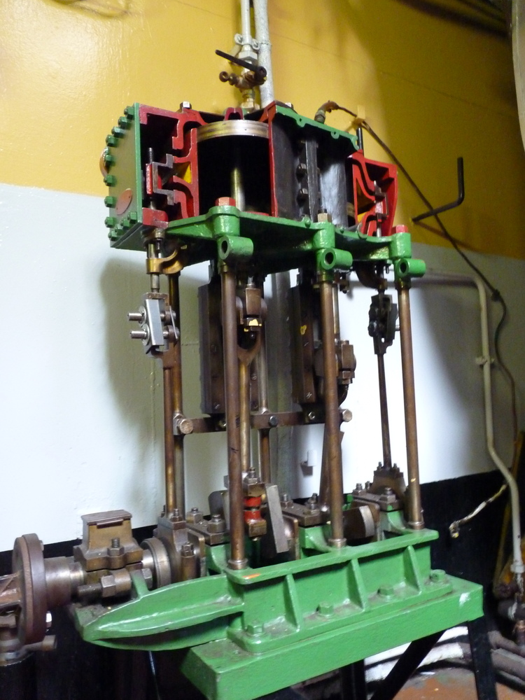 Een opengewerkt exemplaar van een vertikale compoundmachine.