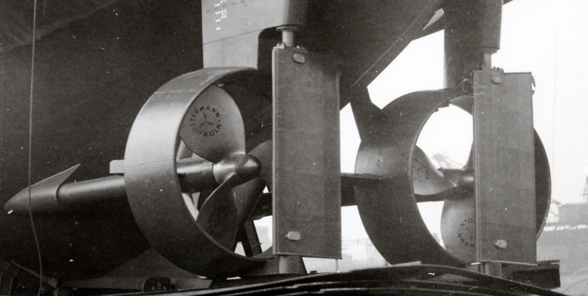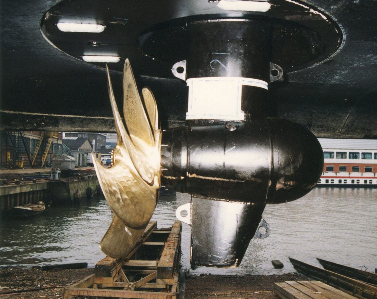 Dit soort roerpropellor wordt tegenwoordig, we hebben tenslotte de 'Engelse ziekte', een azimuth-drive genoemd.
